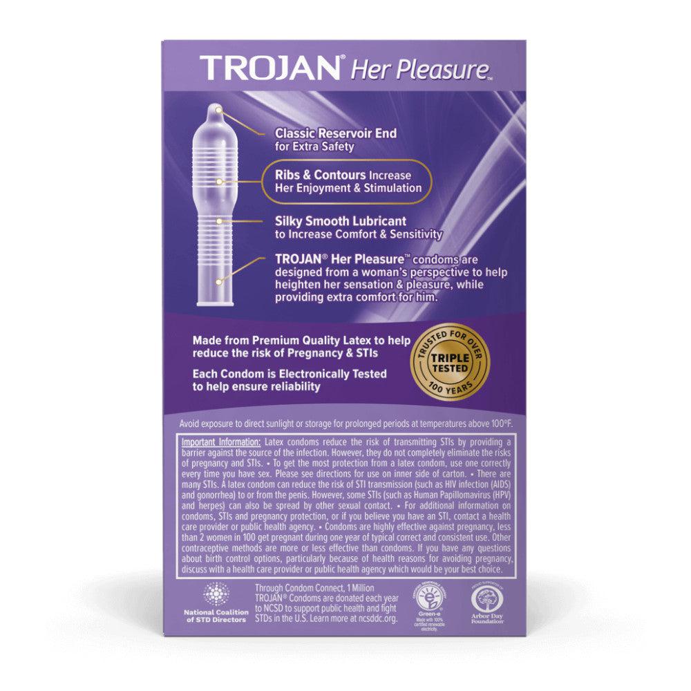 Trojan Her Pleasure Sensations were designed with her pleasure in mind and featured two large ribbing sections - near the middle of the shaft and just below the head - and Trojan's signature comfort shape.