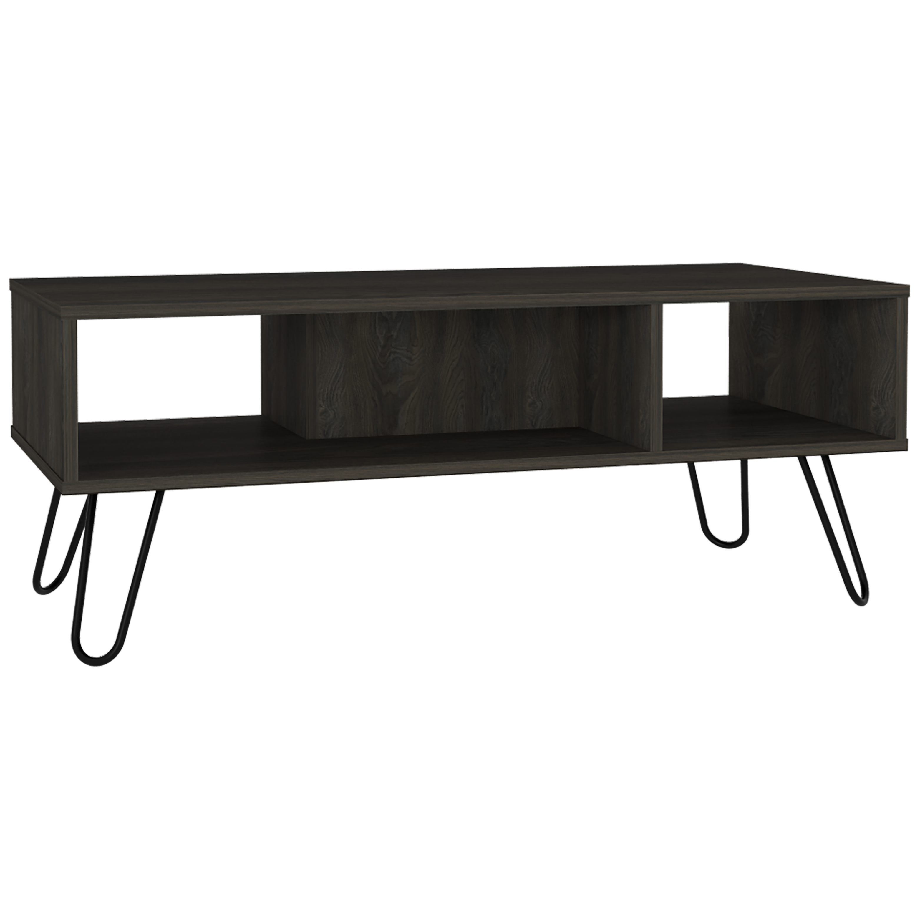 Check out the Minnesota Charcoal Coffee Table - the perfect blend of form and function. The stylish hairpin legs add a touch of elegance, while the espresso-manufactured wood finish gives it a timeless look that will elevate any décor. With multiple open shelves for easy storage and a superior top measuring 39,8" W X 17,7" D, this coffee table is ideal for a cup of tea, your favorite decor, or even your favorite books and magazines.