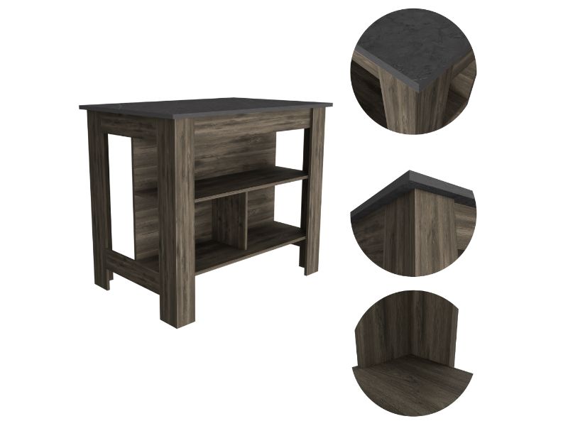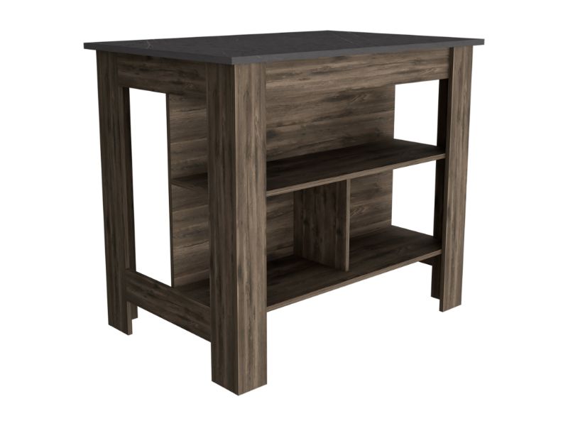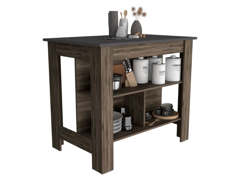 Below the top, you will find a great space to store your stools on one side and a convenient shelves space on the other, with one wide shelf at the top and two smaller frames at the bottom. This shelving space is a practical place to store your pans, pots, or even decor looks fantastic on this kitchen island. Designed with elegant Black Wengue / Light Oak, Black Wengue, White / Onix, Dark Brown / Onix, White / Ibiza Marble, Dark Brown, White / Light Oak, White / Walnut manufactured wood finish.