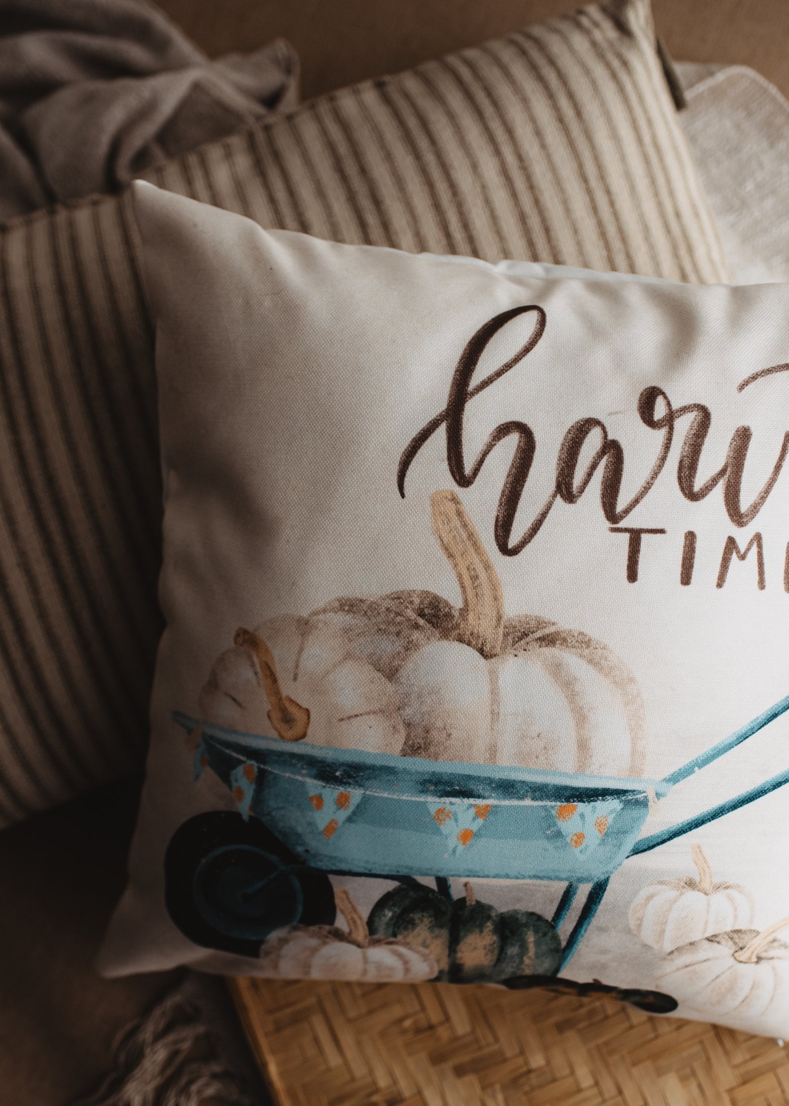Fresh from our Farmhouse Collection is a load of lovely pumpkins picked especially for you! As you give thanks this season and add up your blessings, we challenge you to count at least as many things to be thankful for as there are pumpkins on this pillow print. Happy Harvest Season!