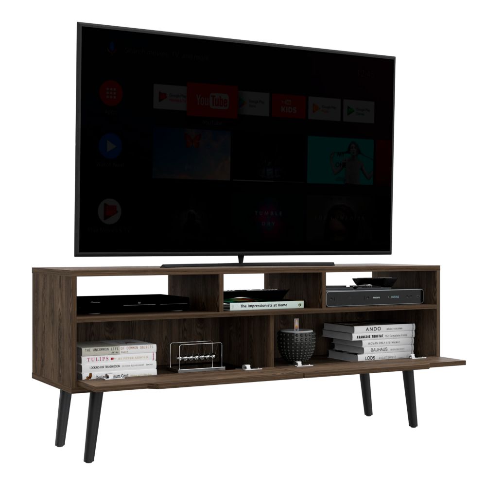 Hamburg TV Stand, If a standard TV stand won't do, the Hamburg Tv Stand is a perfect choice if you're looking for something with both form and function. Its sleek design will complement any room, and its ample storage space ensures that you'll have everything you need at your fingertips. Includes an ample superior top(56'') with a great tv capacity (60'') three open shelves and two-door flexible cabinet wih two interior shelves (66,1''W X 18,9''H) and the final contemporary touch with its four legs (8,6'') Designed with elegant dark walnut manufactured wood finish.