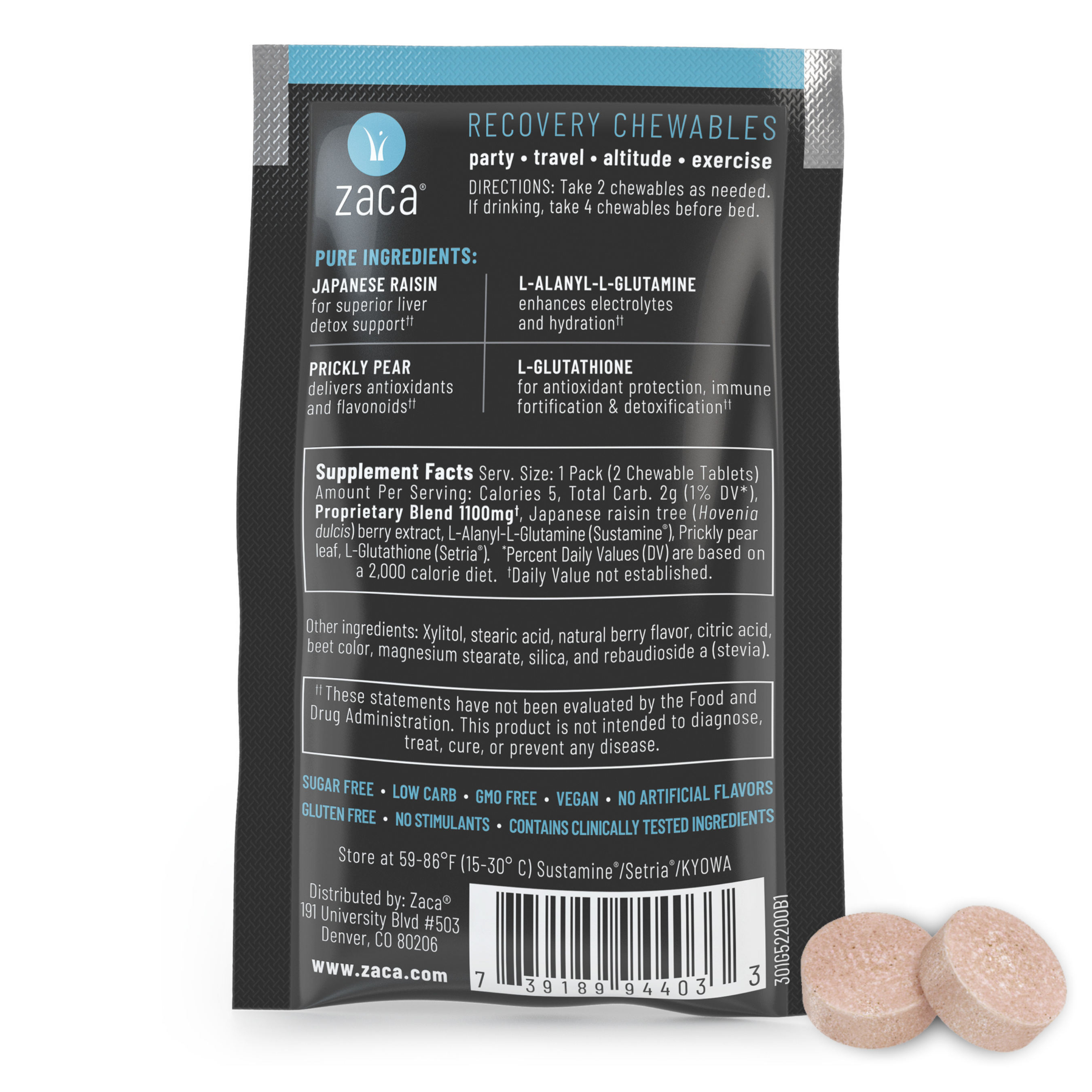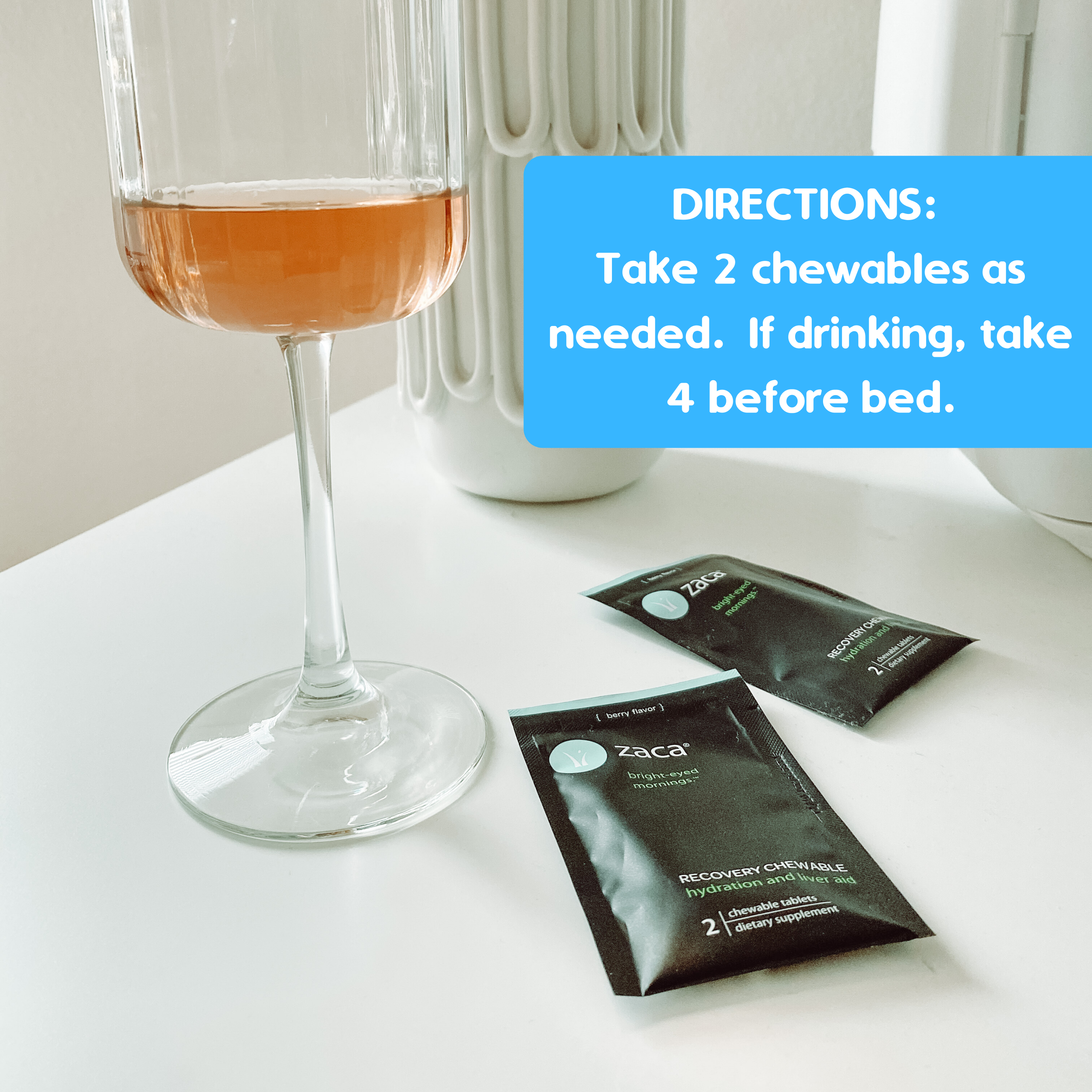 A refreshing berry flavored recovery chewable made from pure ingredients for hydration + recovery. Each pack contains 2 chewables. Simply take 2 tablets as needed. If drinking, take 4 before bed.