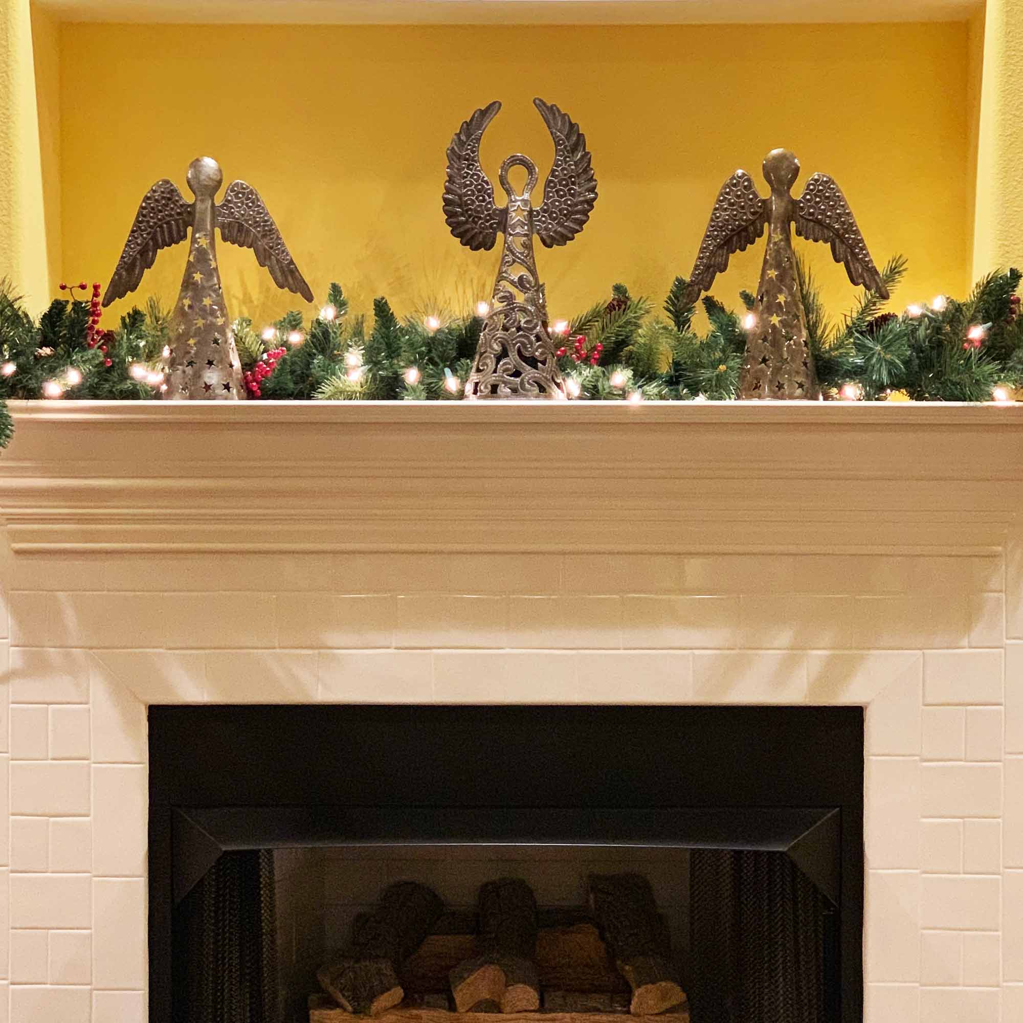 This metal art holiday angel is 16 inches tall, making a great decorative piece. The angel is large enough to be back lite with a candle. Handmade from steel drums.