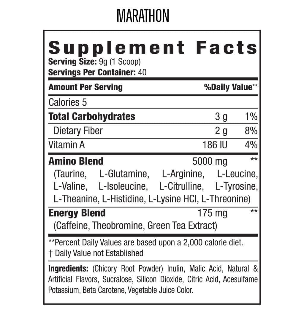 MARATHON formula will help you give it your all on race day-- go out with confidence knowing that our secret blend of amino acids and clean energy matrix, will not just keep you running strong all morning, but continue to supply you with clean energy throughout day without compromising your sleep.