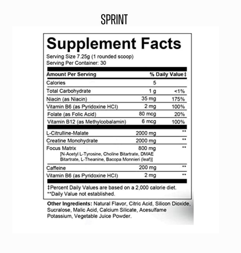 SPRINT Pre-Workout Matrix is designed to give you an epic boost for cardio and training. With just one scoop in cold water, this formula will help enhance energy, focus power and stamina.