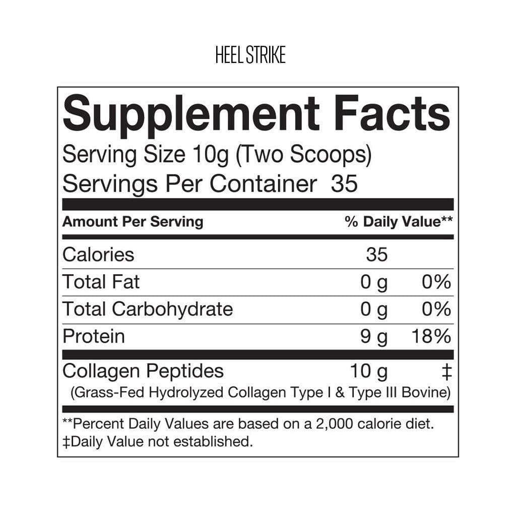 Heel Strike(Hydrolized collagen peptides powder) Supports healthy hair, skin nails, joints ligaments & tendons.Add to your morning cup of coffee or smoothie. This formula has so many benefits!