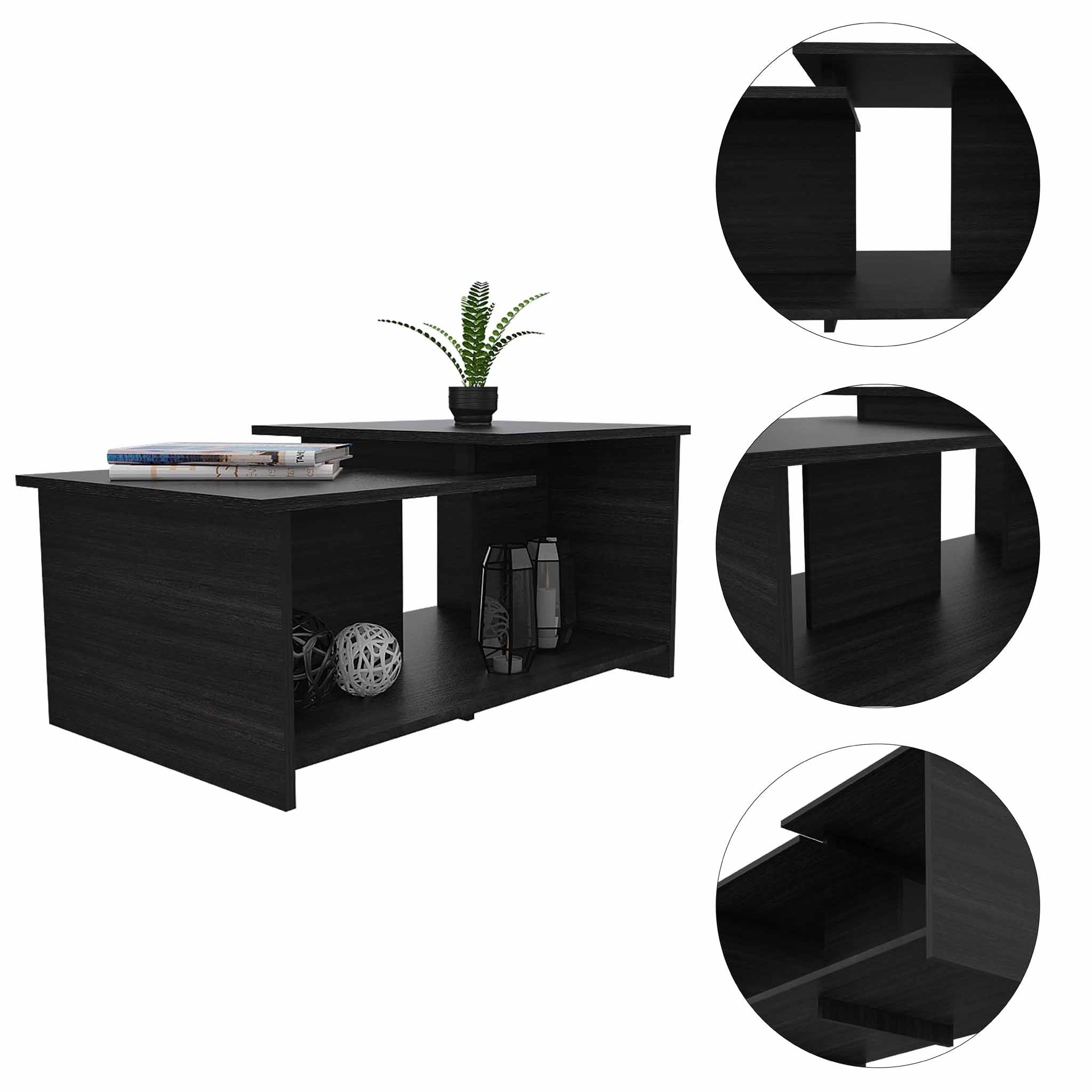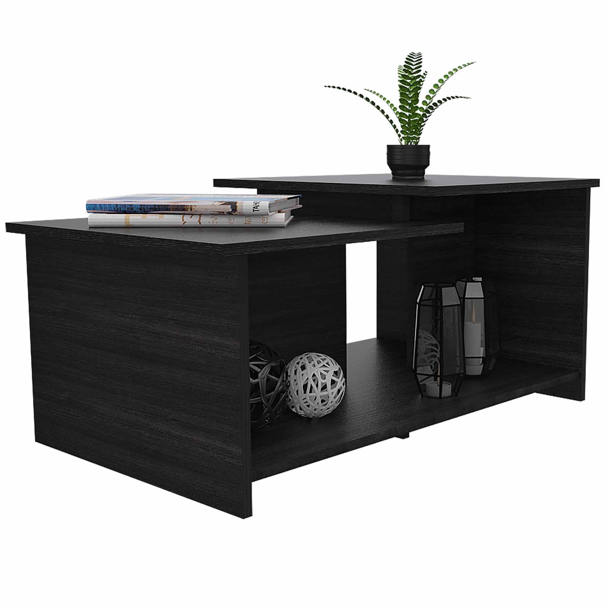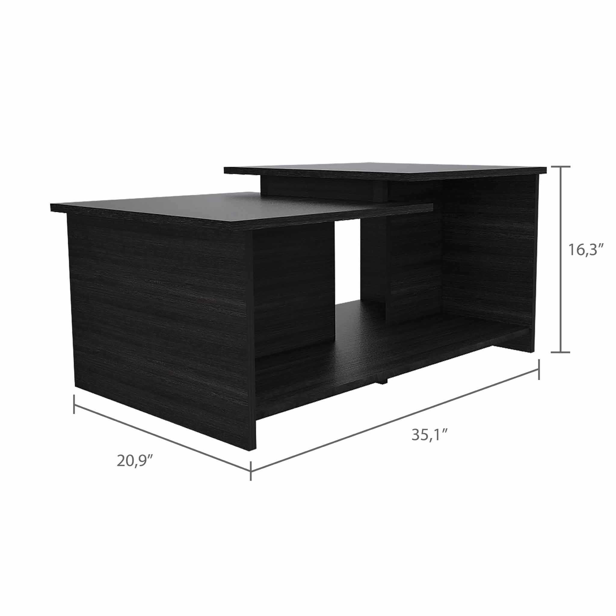 The Waycross Coffee Table beautiful, elegant, and fantastic are the words that best describe this spectacular coffee table. Its asymmetrical design, a little abstract, gives a touch of modernity to the space where you place this beautiful piece of furniture. It features a modern and elegant design, high-end two levels top surface, an all-around open shelf to display all types of décor, easy to assemble. Designed with elegant Black Wengue manufactured Wood finish.