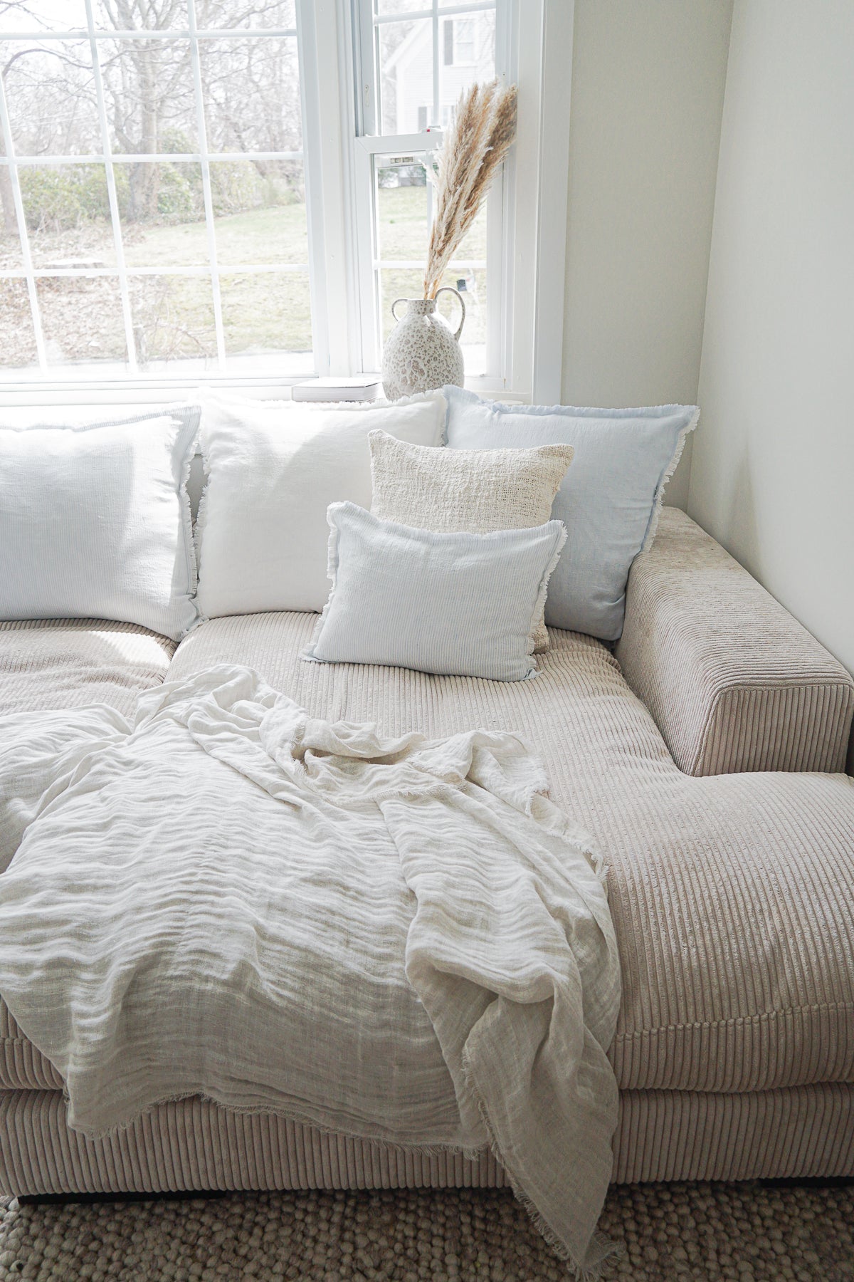 Our White So Soft Linen Pillow is Soo soft- you won’t believe it's linen! This yarn has a slight nub which gives it a beautiful natural texture. Edges have a self-fringe on all sides.
