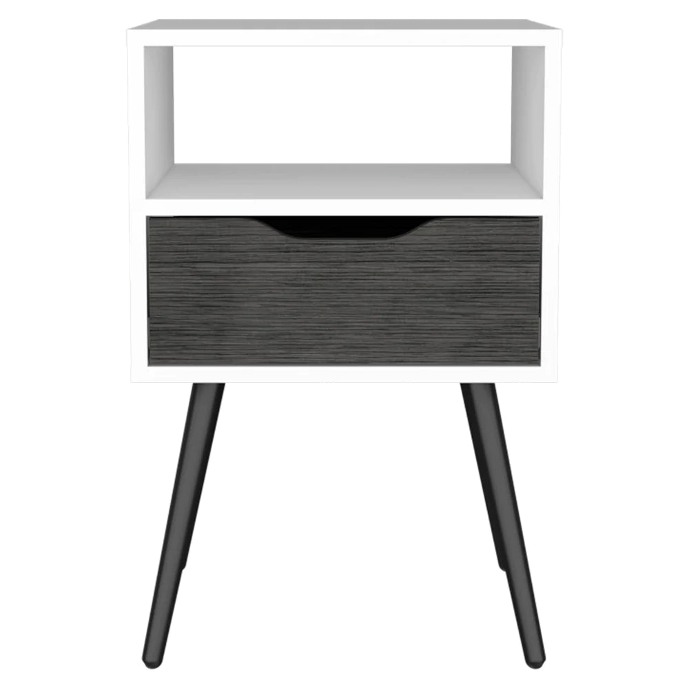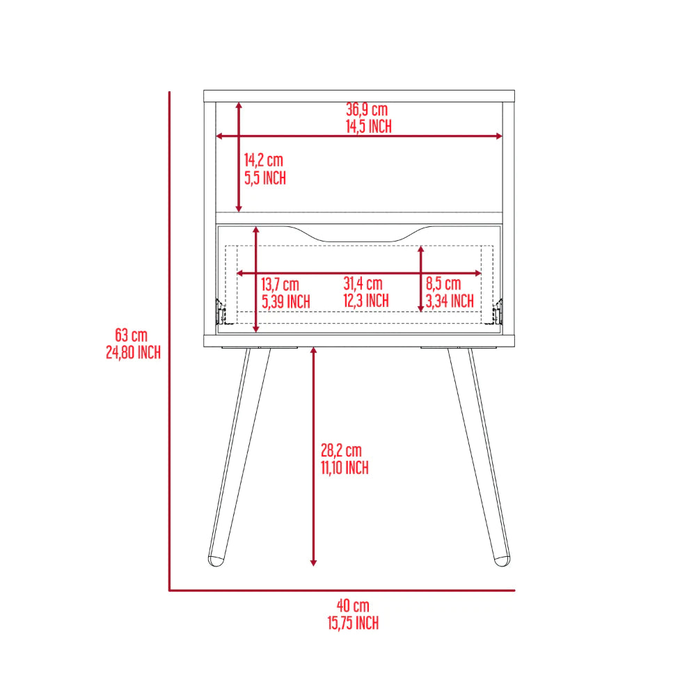 This nightstand has a modern and contemporary style for its four legs, giving a unique touch to your room. You can use it in your room or in the place you prefer; it works perfectly in any space! With a perfect Superior Top (20,9'') to display your favorite decorations or your books, it also has an ideal shelf for smaller objects, as well as a perfect drawer for your most precious things and one open shelf (5,5''H X 14,5''W)