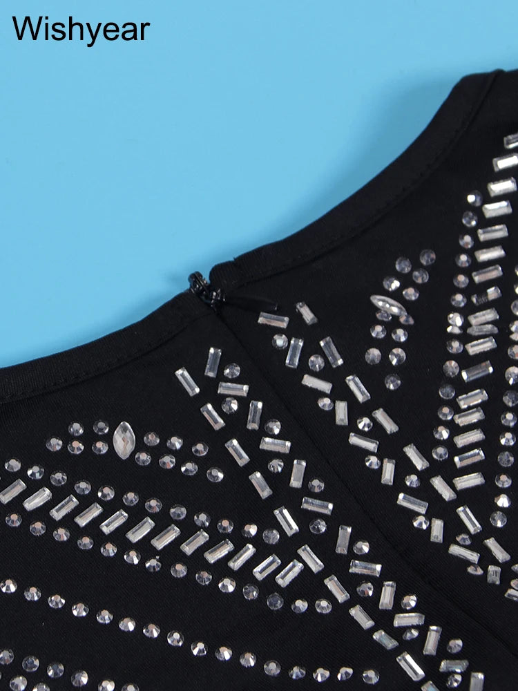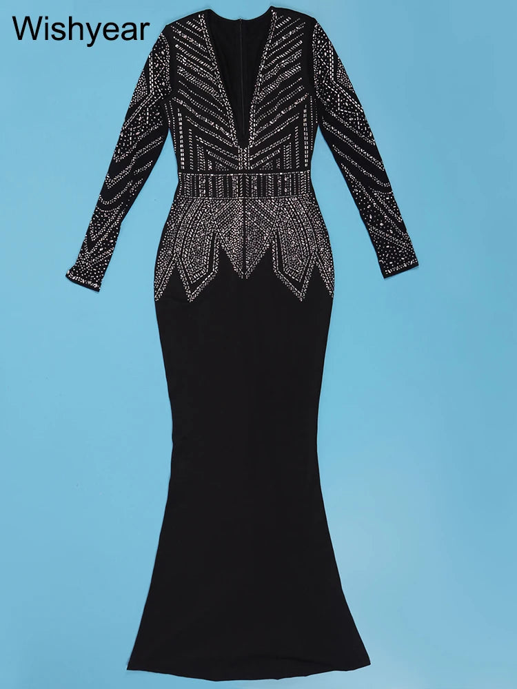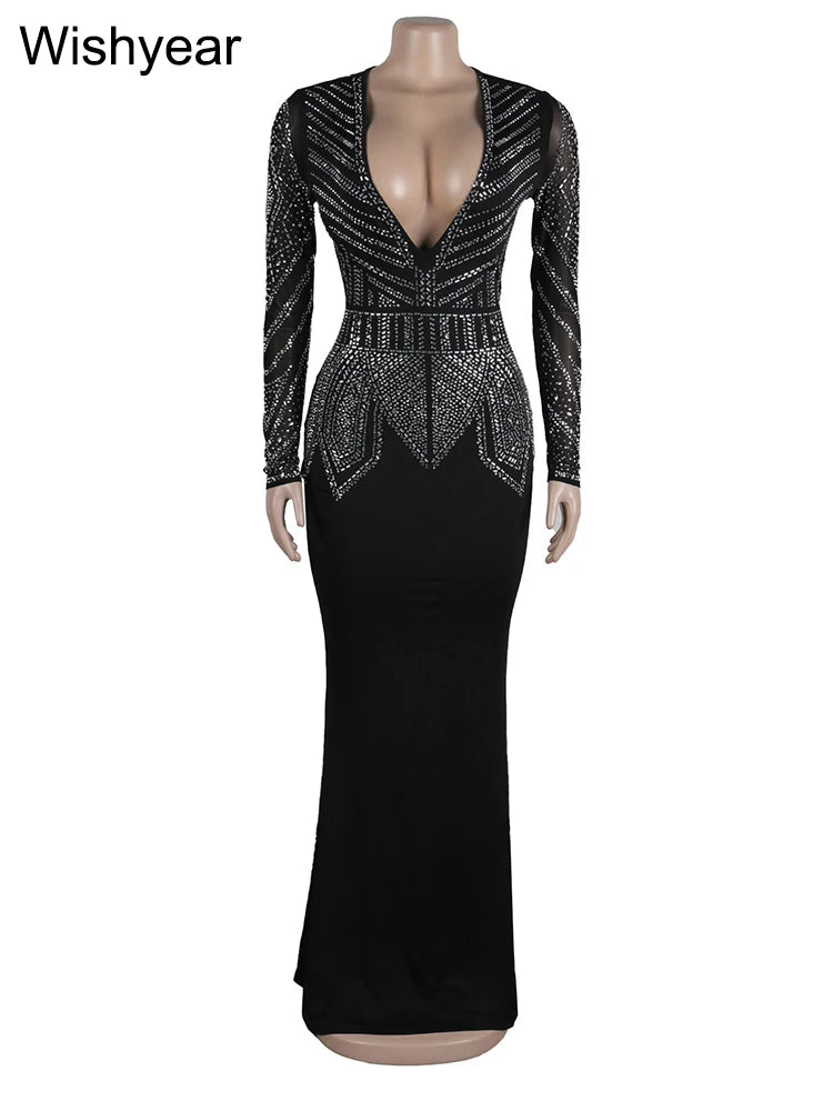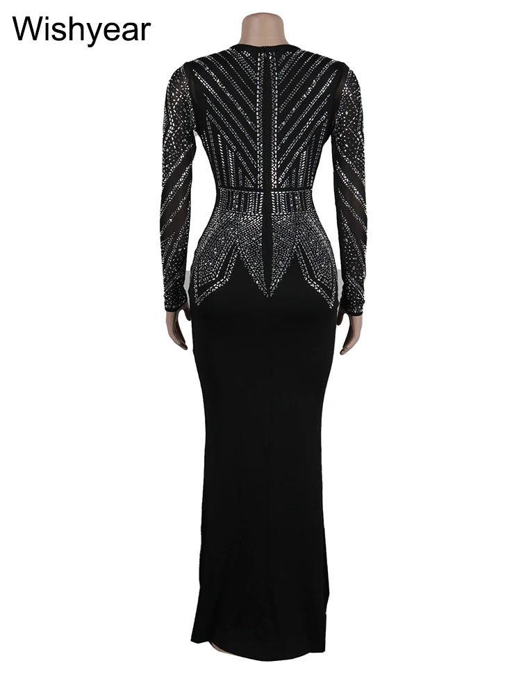 Rhinestone Maxi Dress with See-Through Mesh Long Sleeves