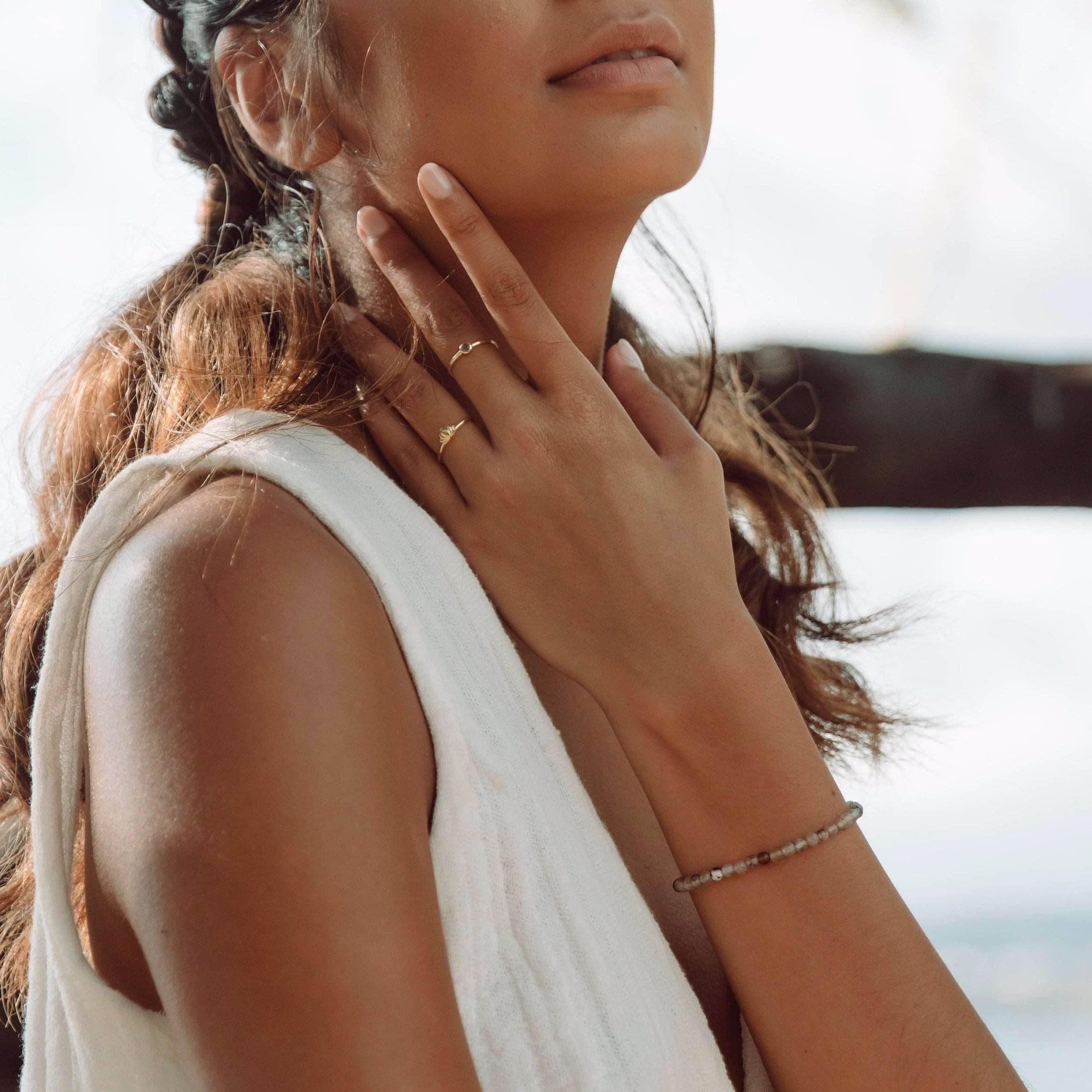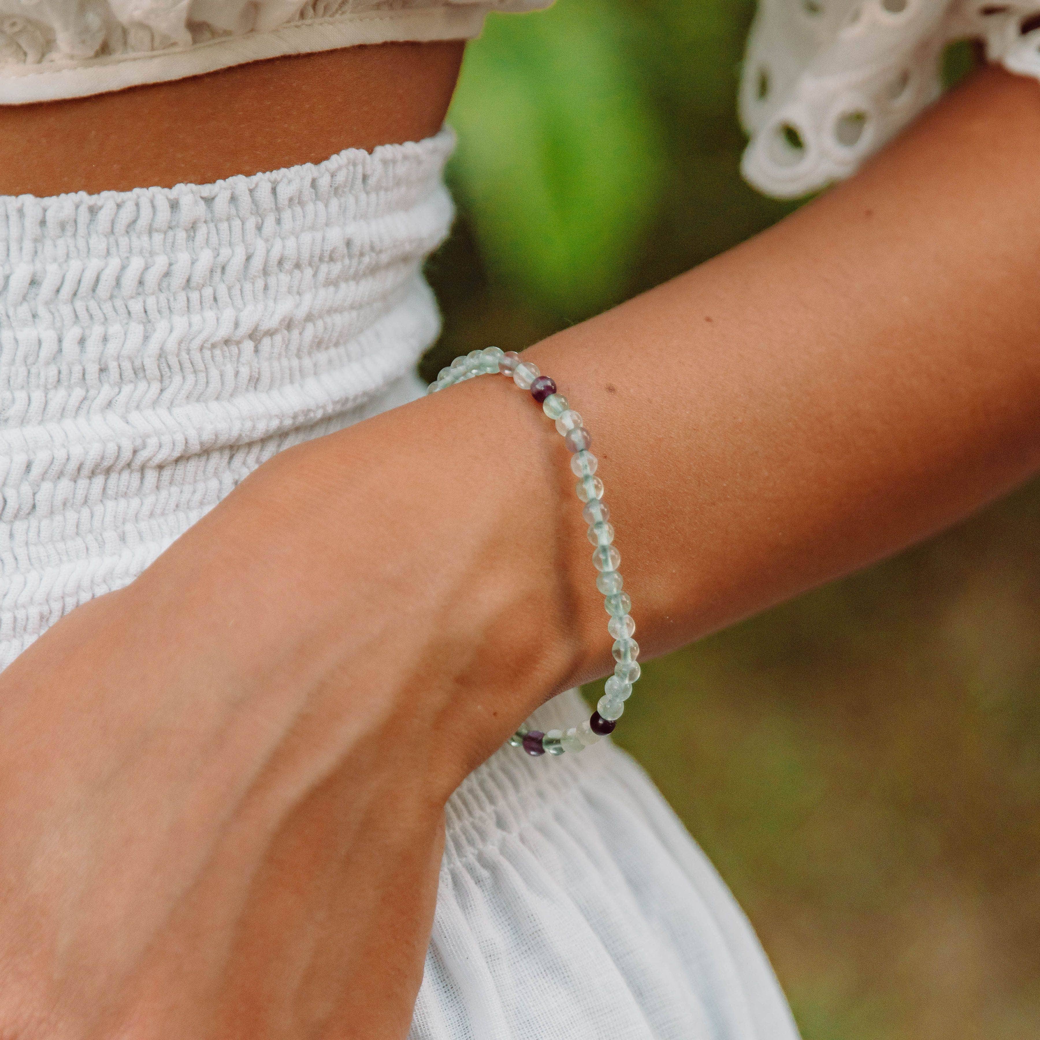 A fluctuation of color immediately captures the eye when wearing the Rainbow Fluorite Energy Bracelet. Along with its shifting shades of purple, green, and blue – this stone is all about creating the freedom of flow and yes to the power of possibility.