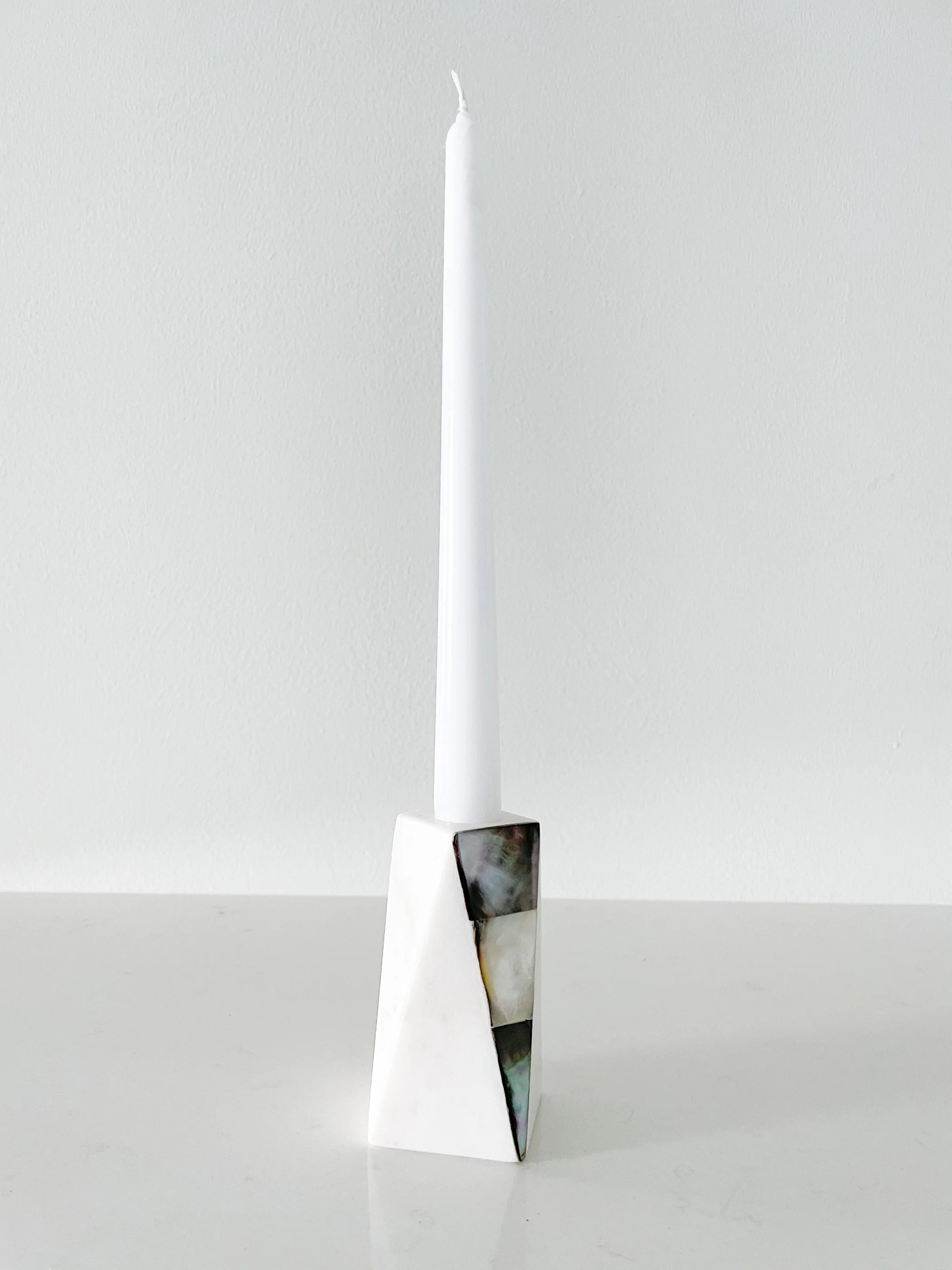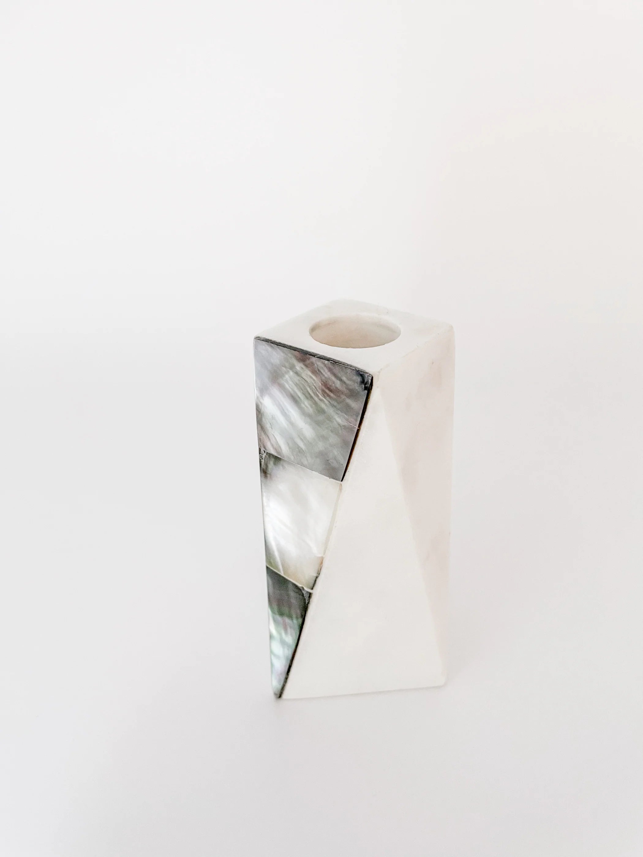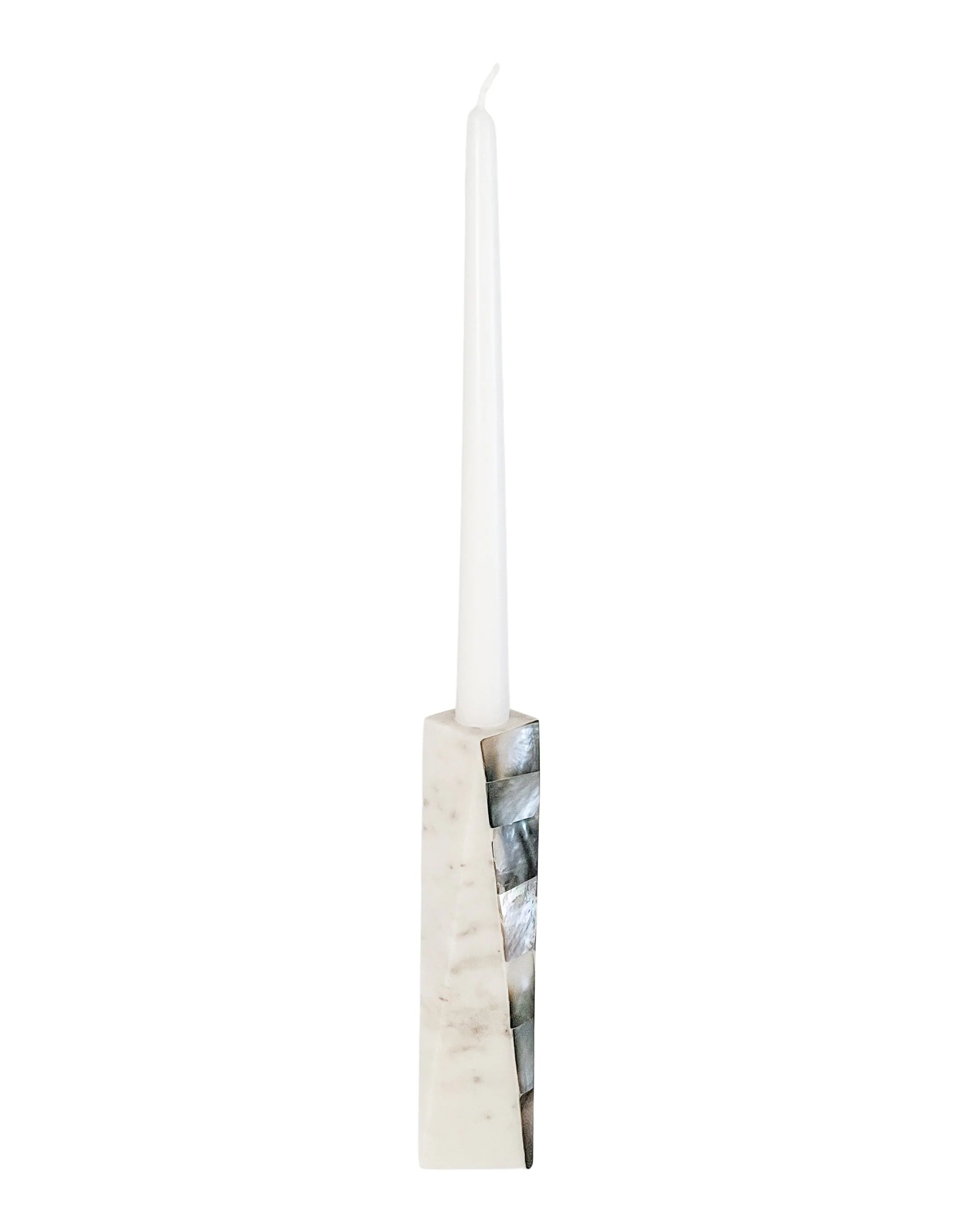 The White Marble Grey Mother of Pearl Candle Holder is accented with a natural iridescent grey color tones with hints of light golden accents. Holds a 3/4" tapered candle which is sold separately.