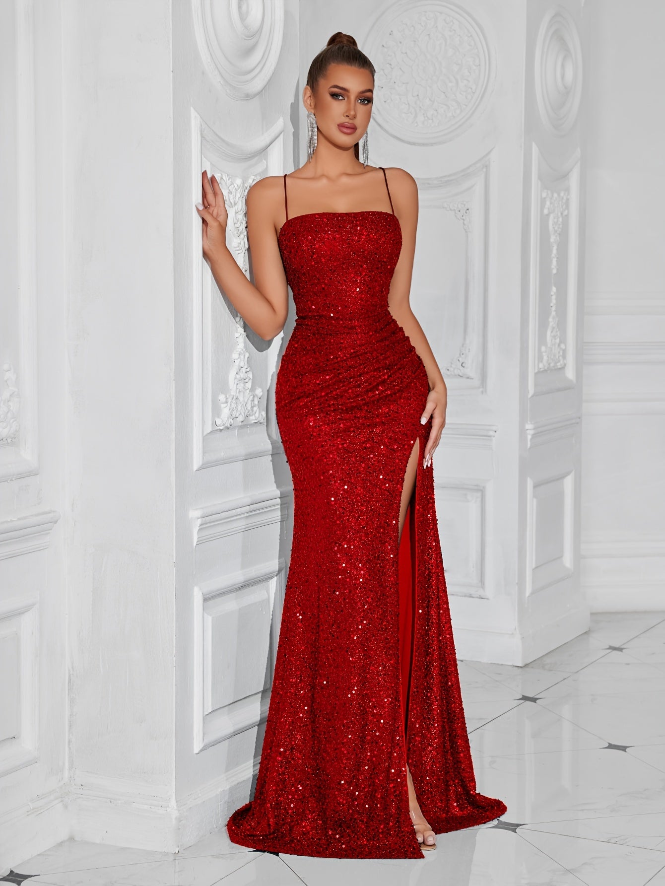 Elegant Sequined Maxi Dress with Spaghetti Straps, Cross-Back Waist, and Front Slit