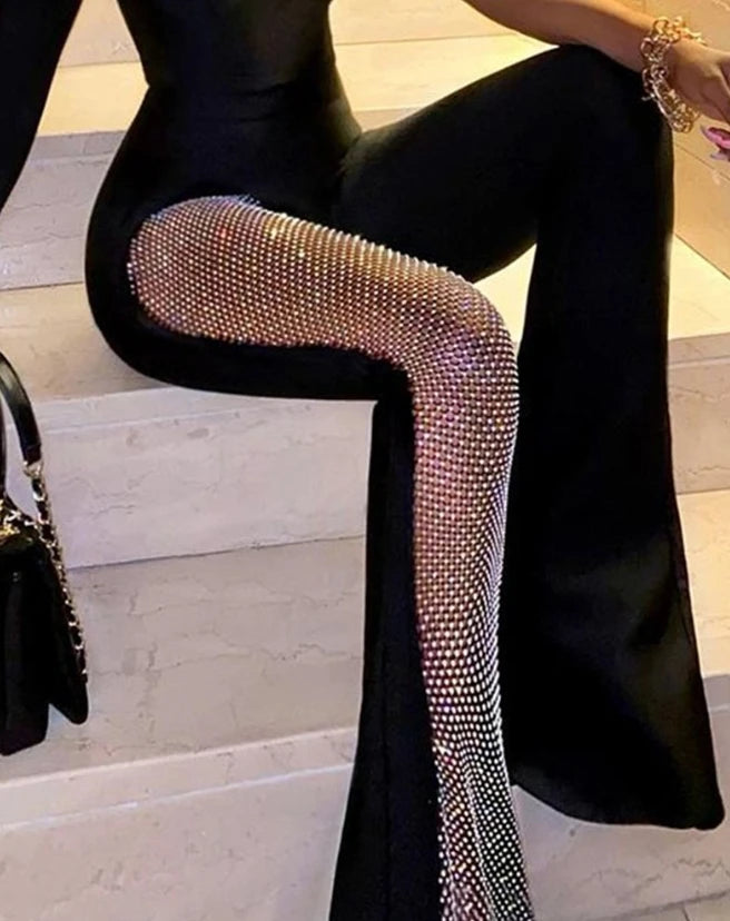 Rhinestone Fishnet Asymmetrical Long Sleeve Skinny Flared Leg Jumpsuit