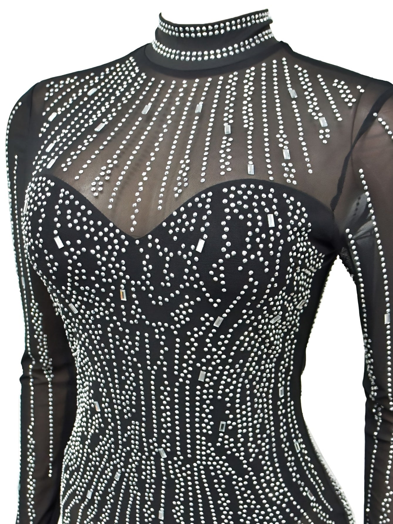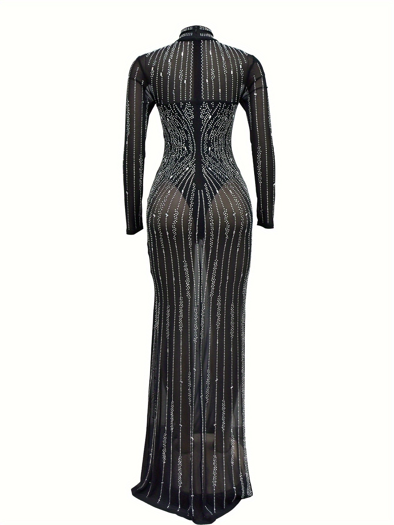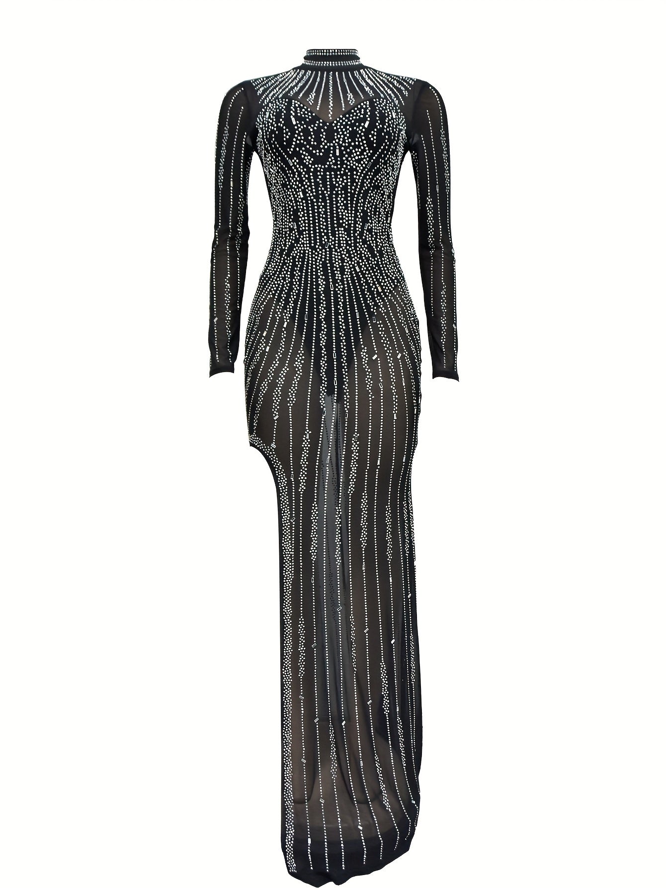 Rhinestone Split Hem Bodycon Asymmetrical Mock Neck Long Sleeve Dress