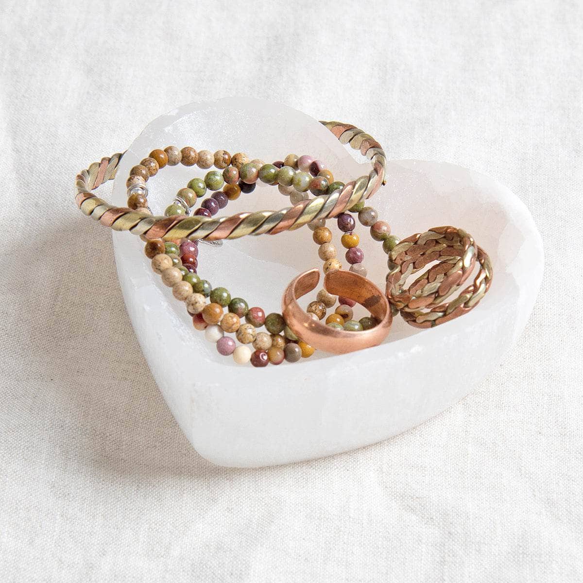 The light and love of this Selenite Heart Bowl will not only help transform your space into something sacred but also creates a dedicated place for crystal care. Using this bowl, you can place your tumbled crystals or crystal jewelry into the open heart of the bowl whenever you feel they need a cleaning. Energetically cleansing your crystals is an important part of ensuring they stay humming at their highest vibrations and shift any dark spots or energy blocks that may have been collected while they have been doing their integral work.