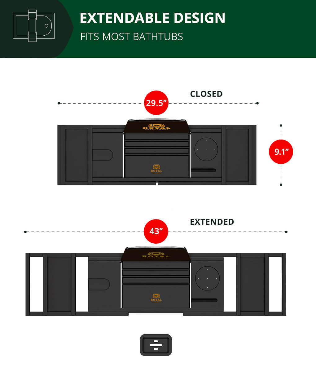 ROYAL CRAFT WOOD CLASSIC DESIGN: You should never feel prevented from splurging on the things you love simply oversize and dimensions. We've gone the extra mile to ensure each dark wood bath caddy is expandable to meet just about ANY bathtub on the market. Simply extend its arms and watch it grow from 29.5" to 43" in no time! Made to accommodate a broad range of narrow to ultra-wide, stand-alone bathtubs. Its silicone gripped lining also ensures your tray stays in place as you soak.
