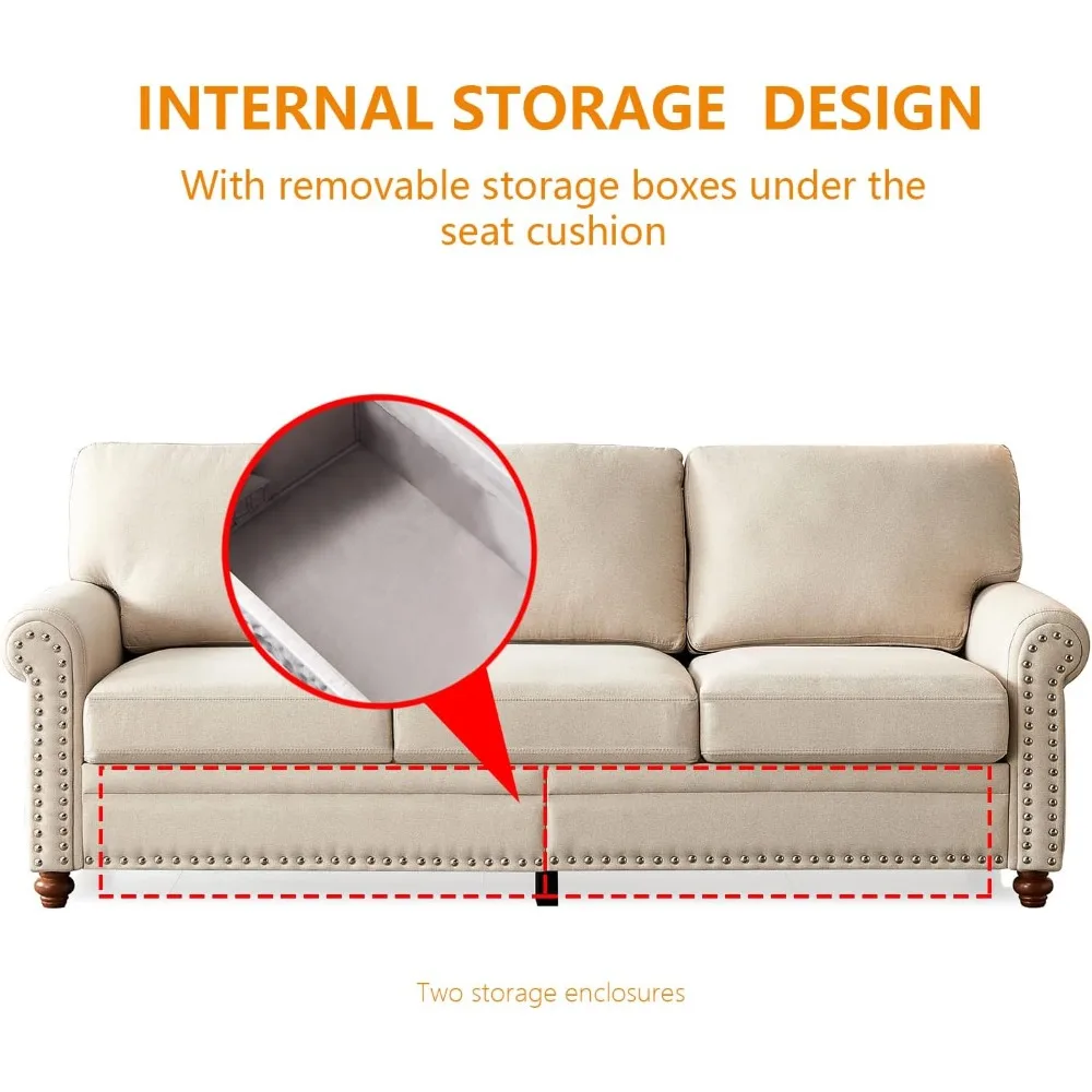 Modern 3-Seater Sofa with Rolled Arms and Wood Legs, Nail head Trim