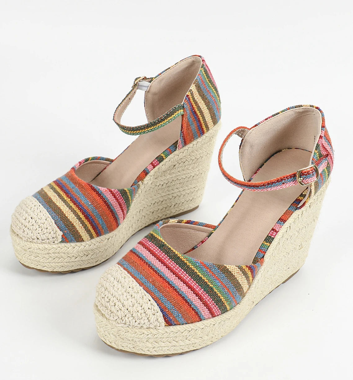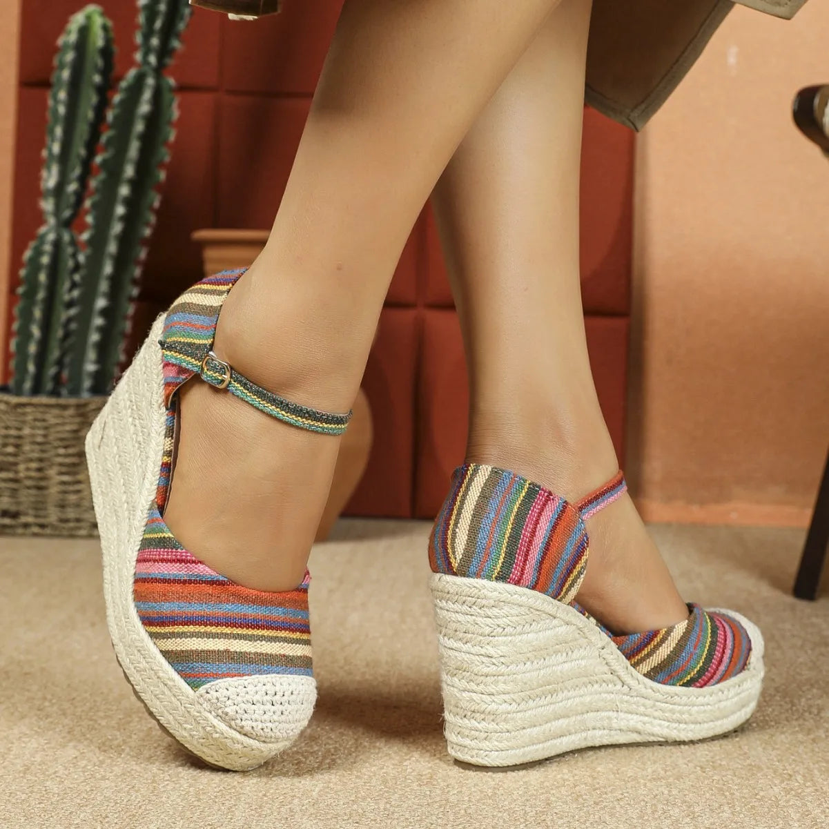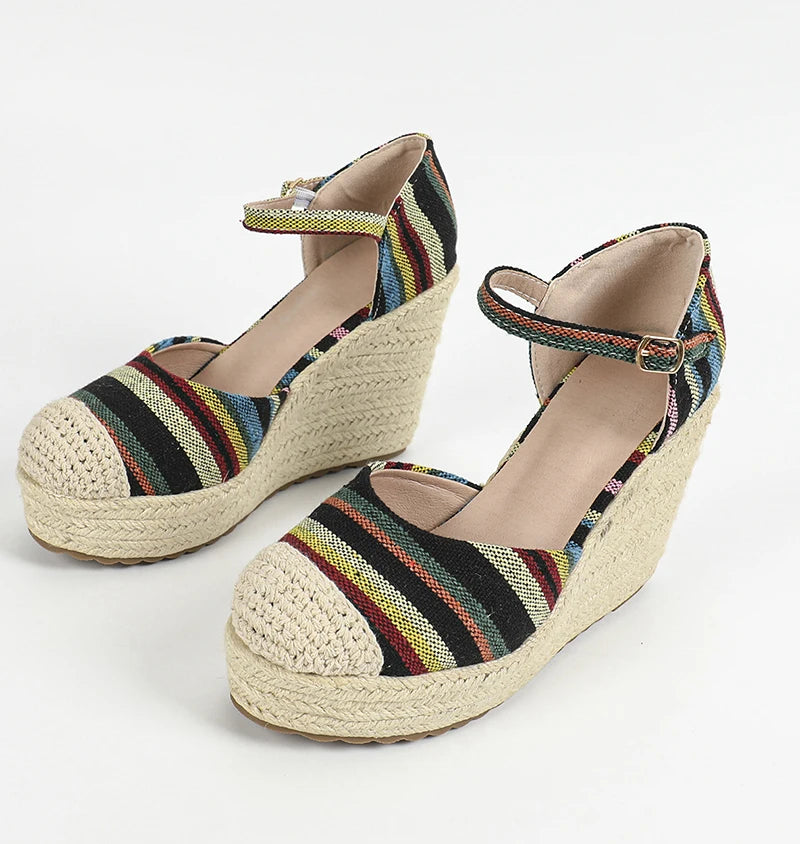 LIHUAMAO Bohemian Round Toe Platform Wedge Ankle Strap Sandals