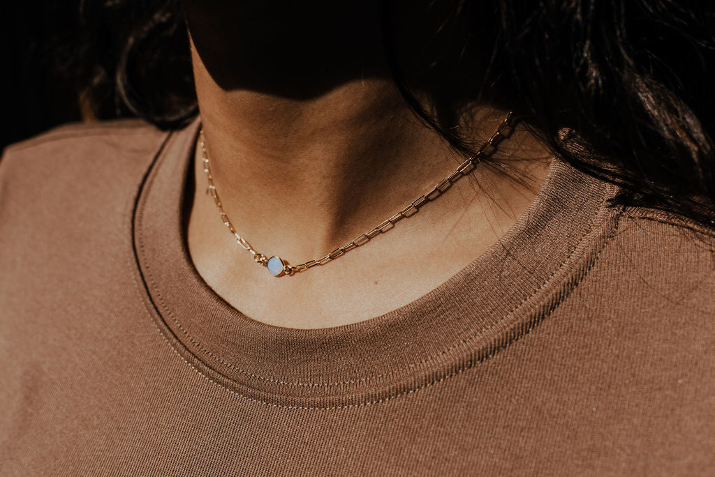 One of a kind gold filled bezeled Opal charm on high quality 14k gold filled link chain.