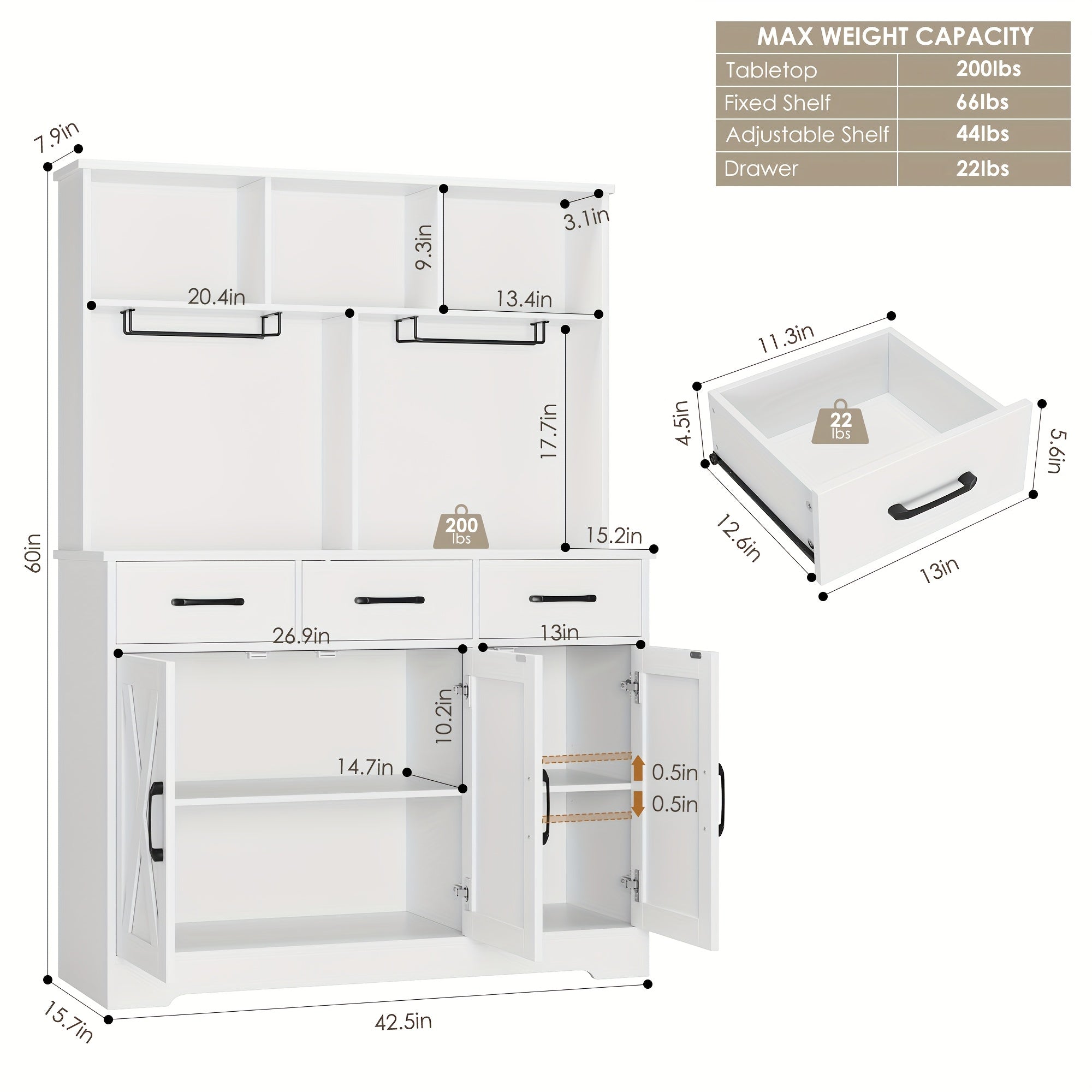 Farmhouse White Kitchen Storage Hutch with Coffee Bar Includes 6 Shelves & Drawers