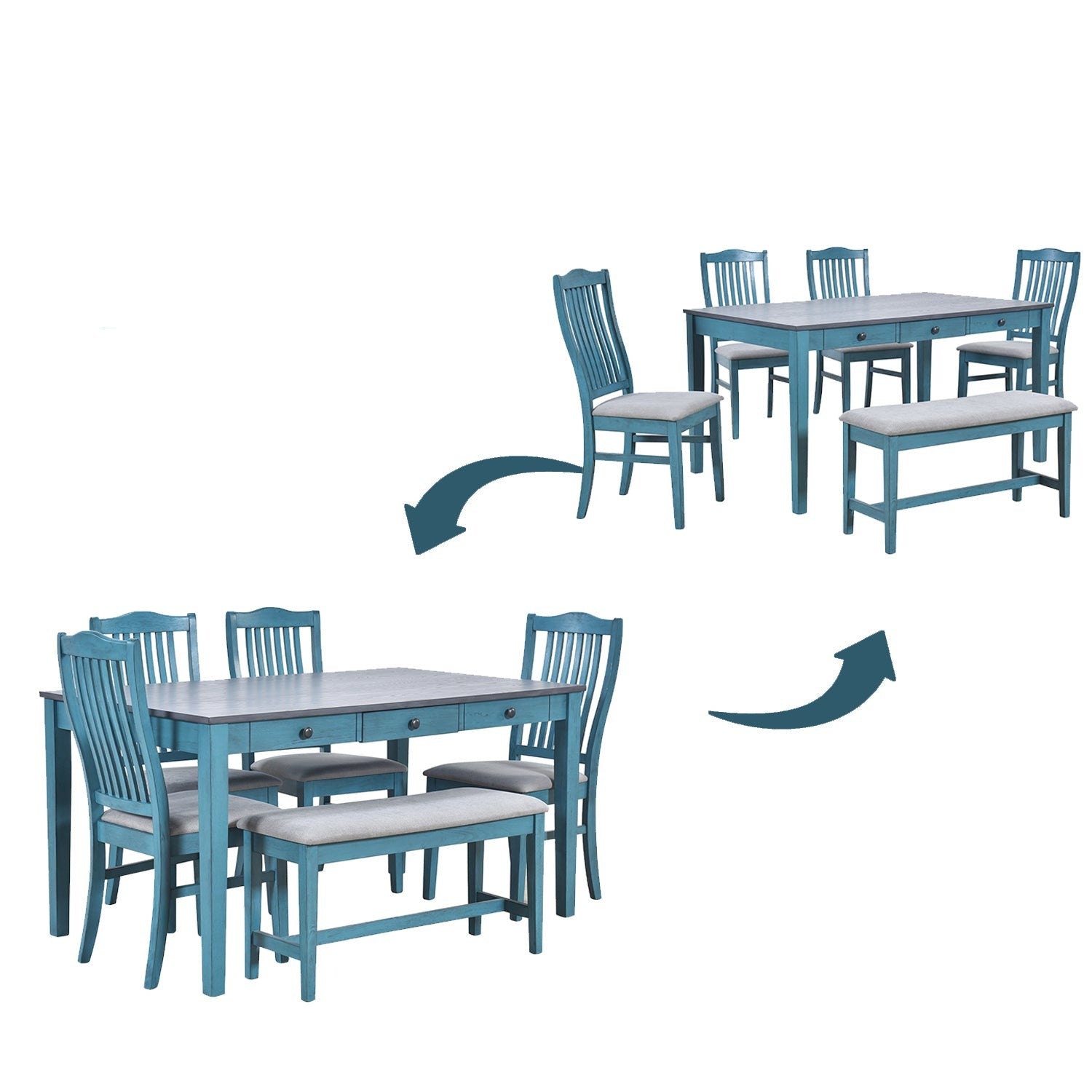 • This compact 6-piece dining set, featuring a vintage 2-tone finish, is expertly crafted with a solid rubberwood frame and legs for long-lasting durability.