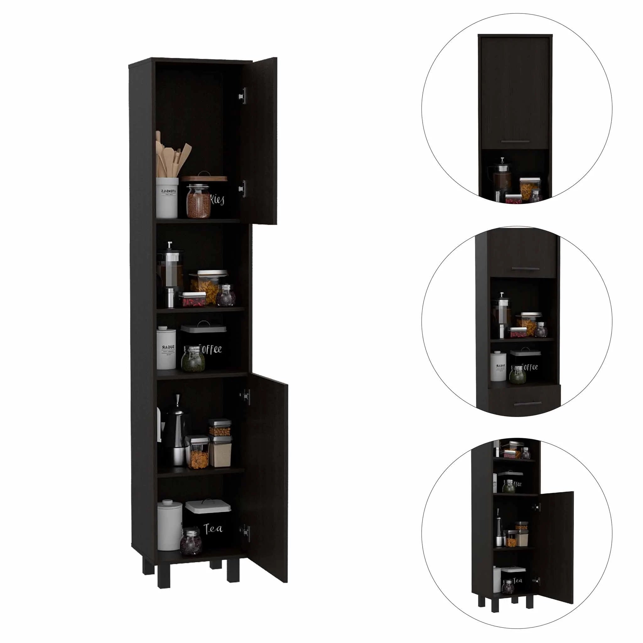 The Sheffield Pantry Cabinet perfect for small spaces, with an ergonomic, modern, and contemporary design, is ideally suited to your needs to store many kitchen accessories in minimal space. Thanks to its great height, you can store what is necessary to keep a kitchen in good condition, and free of clutter. It features a 78”-Inch-high pantry, two open shelves, a bottom cabinet with two interior shelves, top cabinet with 23" H x 13.7 " x 15.5" dimensions. Designed with elegant Black Wengue, White manufactured wood finish.