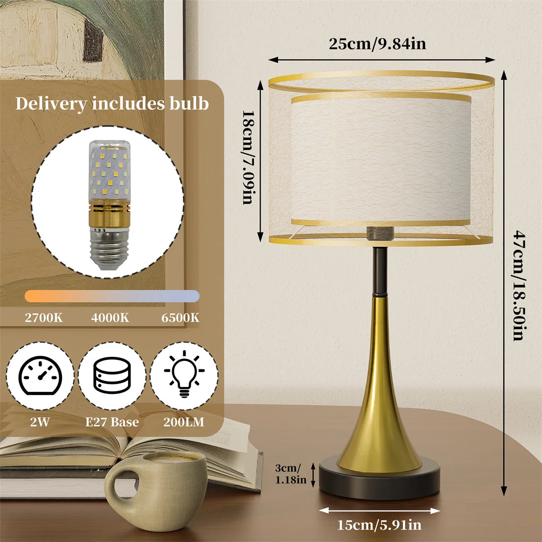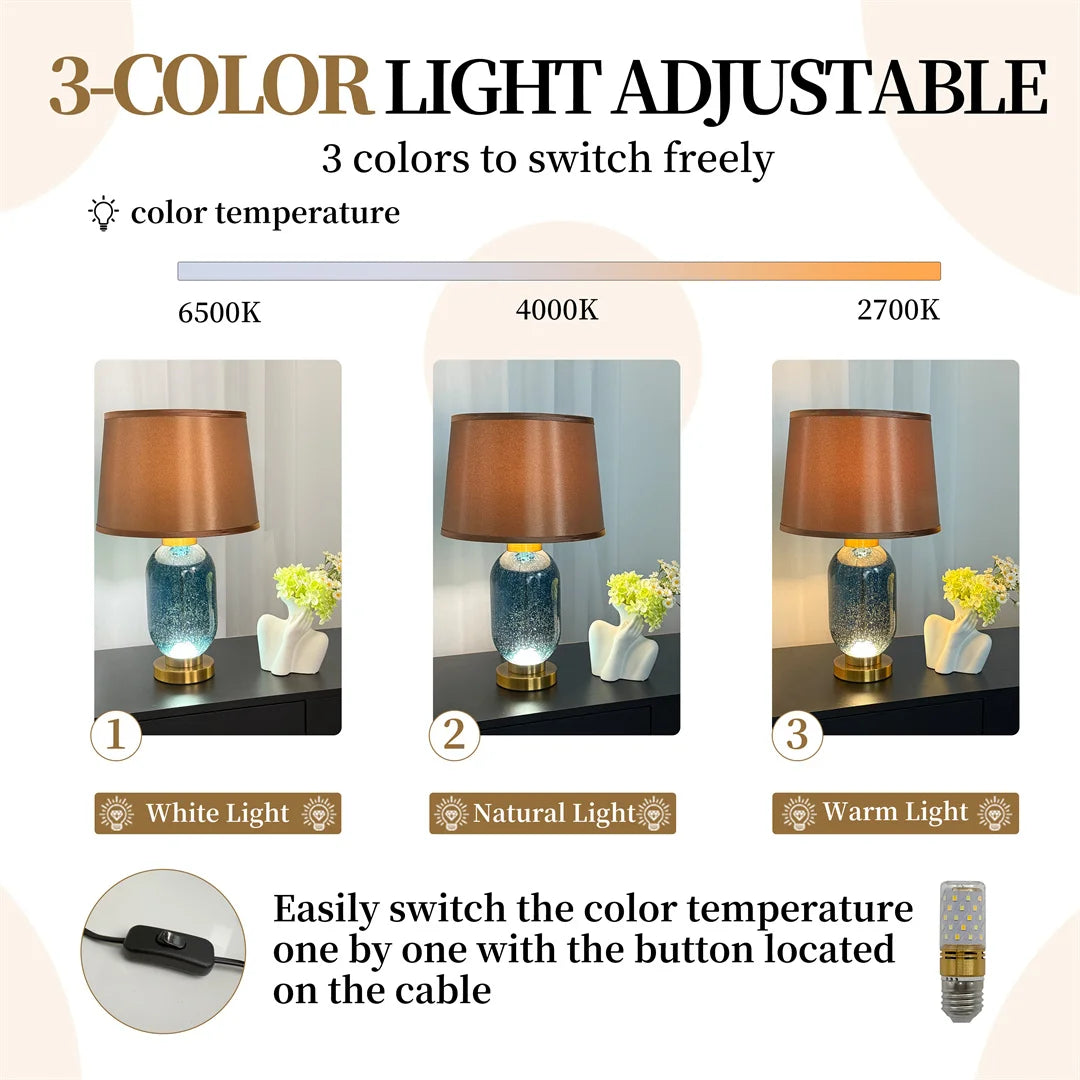 Adjustable Three Setting: This table lamp works beautifully with E27(E26) LED bulbs for energy-efficient and long-lasting light, emitting 8W, the lamp casts three lighting settings, warm 2700K for cozy ambiance, neutral 4000K perfect for daily activities with a balanced tone, cool white 6500K enhances focus and bright illumination for work or reading, easily changes the lights to cater to your activities and moods with its switch button, ensuring comfort in any environment.