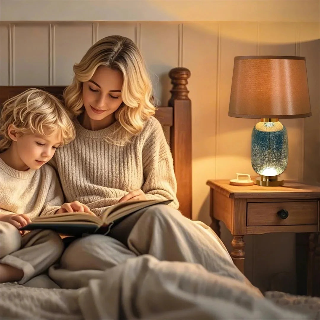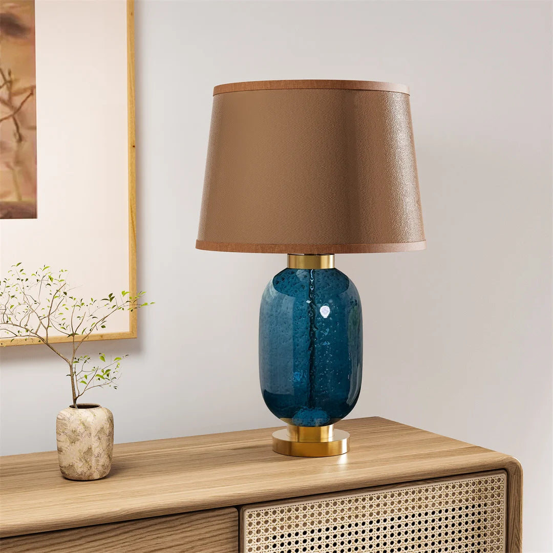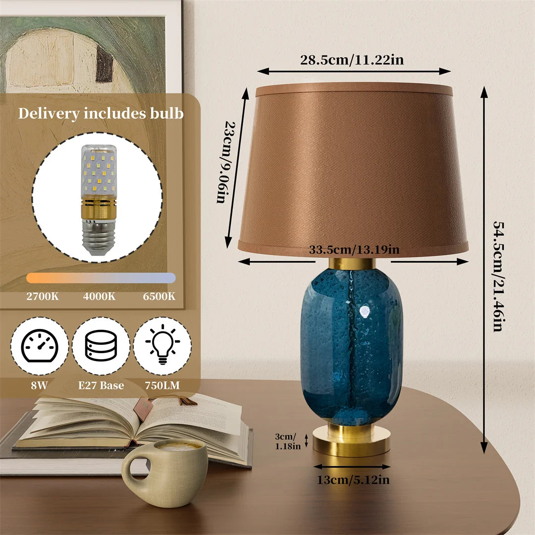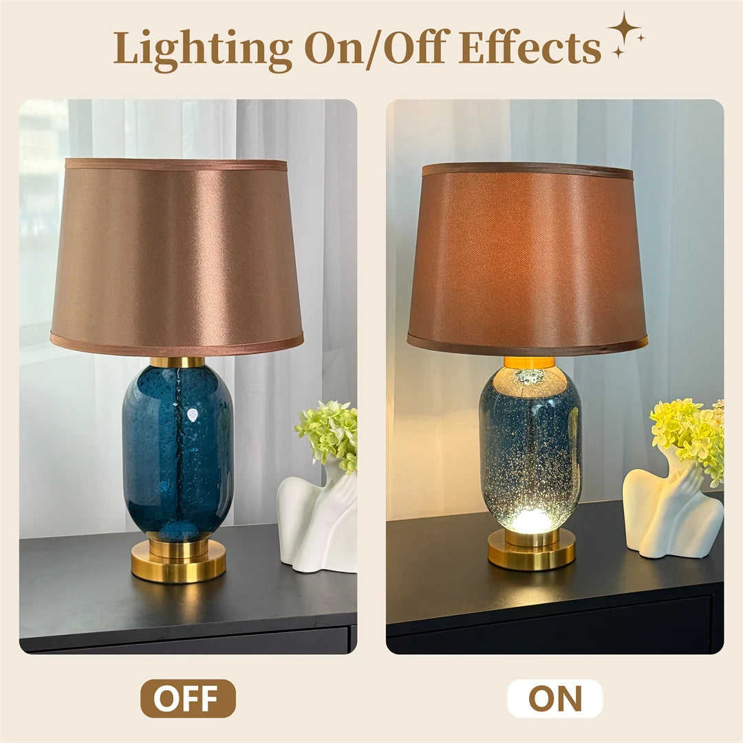 Vibrant Elements Design: Featuring a beautiful blue-tinted glass lamp body with metallic-finished brown lampshade and brushed gold hardware, this nightstand lamp incorporates a striking combination of elements that add both bold color and artistic touch, introducing an element of luxury and sophistication that can transform the look of your rooms, also create a harmonious contrast that draws the eyes