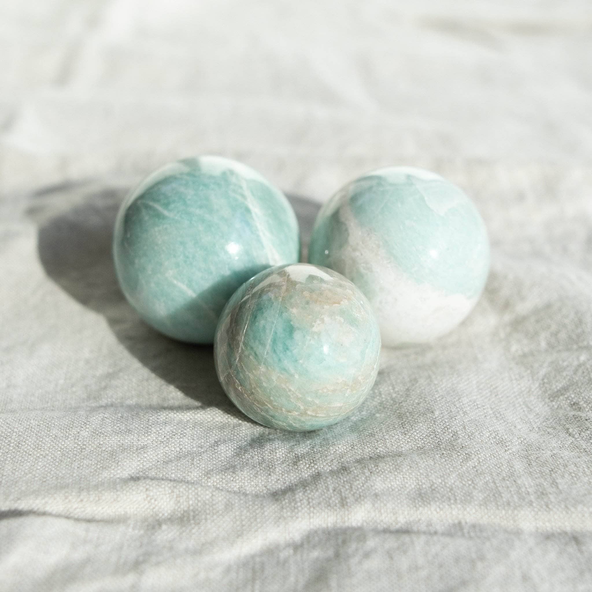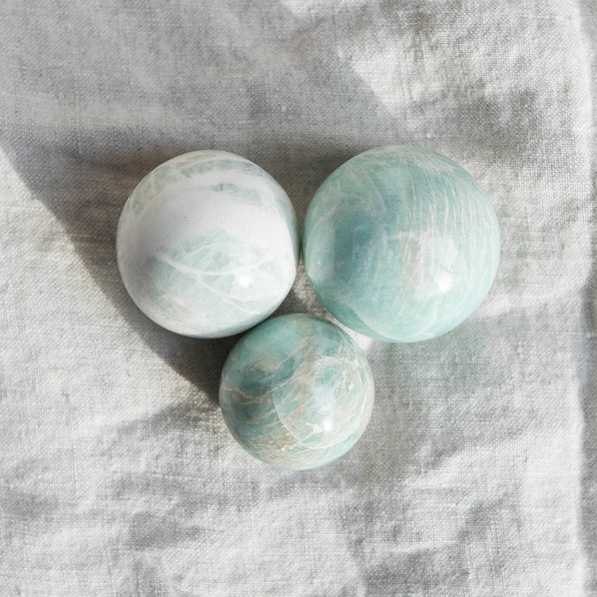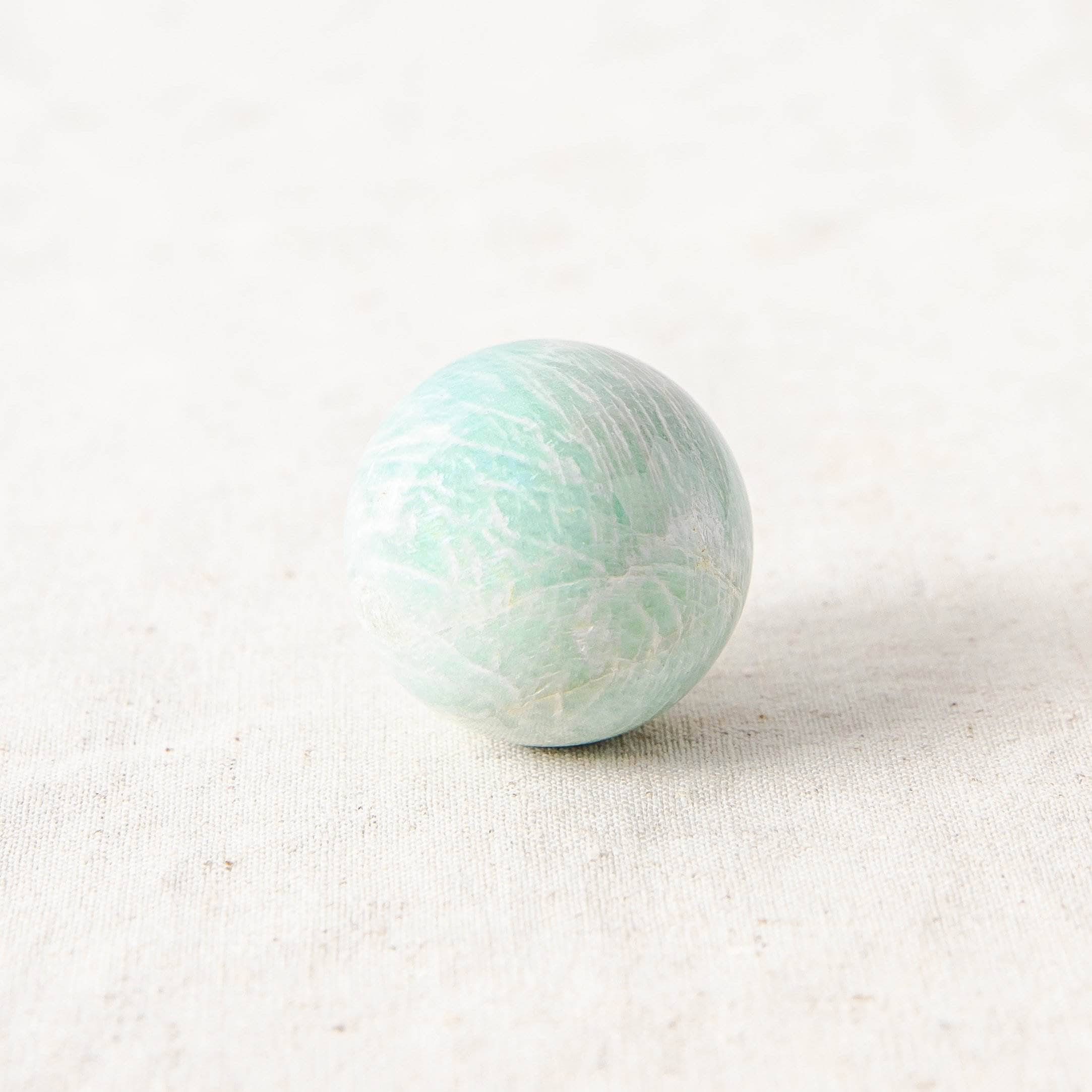 While many turn to Amazonite in the form of tumbled stones, rough cuts, or pretty polished jewelry – the spherical shape lends even more weight to the healing nature. A sphere represents the universe in all its wholeness. Like the world that spins, it is complete.