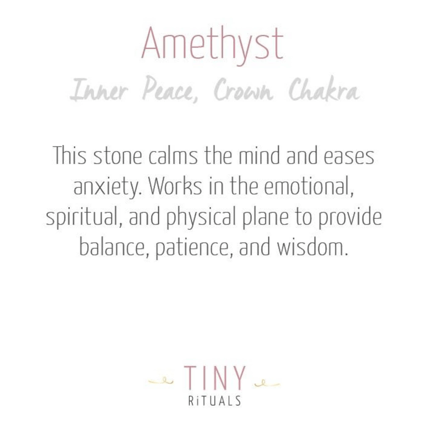 Coming from the Greek word for not intoxicated, the Amethyst stone serves to keep our minds clear, our third eye open, and our crown chakra sending out a beaming light. The purple color of Amethyst is always something to love - purple gemstones symbolize wisdom and insight, and knowing that we are tuned in to our deepest powers of perception helps us move with ease and with less anxiety.