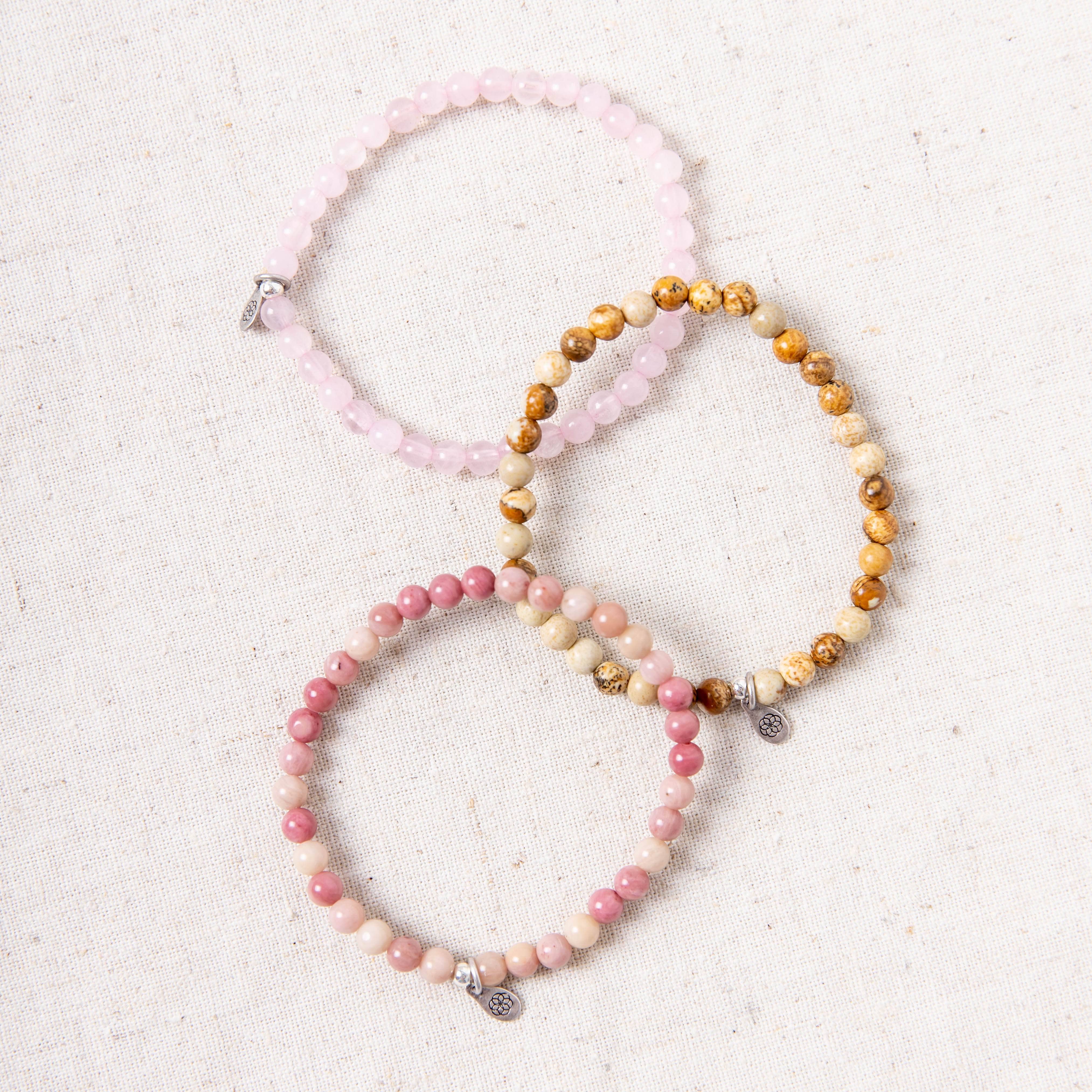 Let the wild and beautiful energy of your love flow with this Creativity and Love Energy Bracelet Set. Bringing together the creative moods of pretty Picture Jasper, the sweet warmth of Rose Quartz, and the vibrant heart beater of Rhodonite, these three powerful bracelets brighten up your soul.