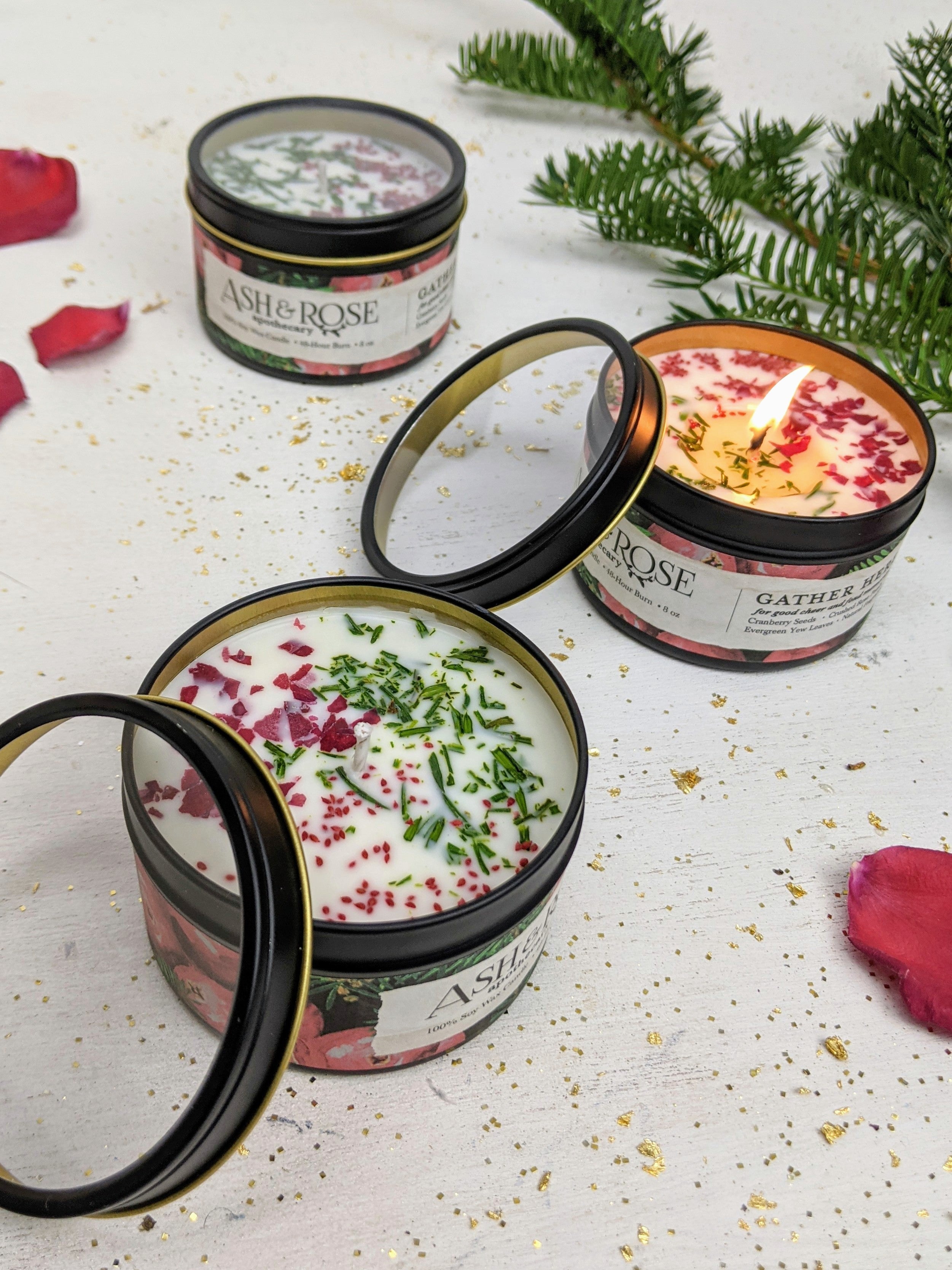 Pure soy wax candle, handmade in the USA with non-toxic and phalate-free fragrance oils, rose petals and yew leaves from our own gardens, and USA grown cranberry seeds.