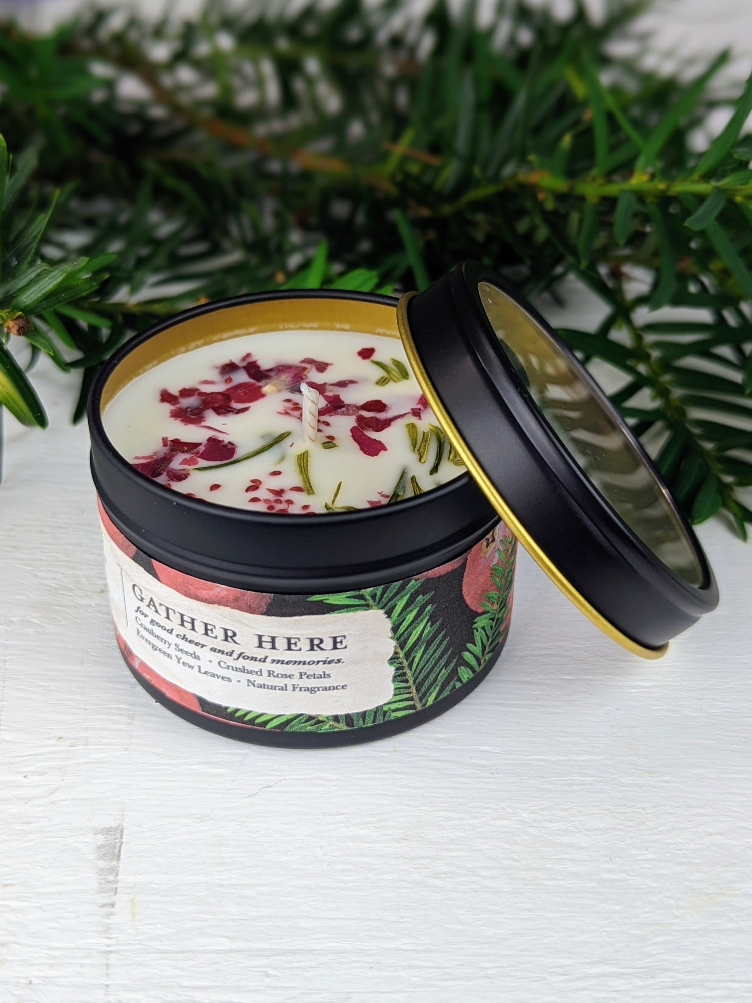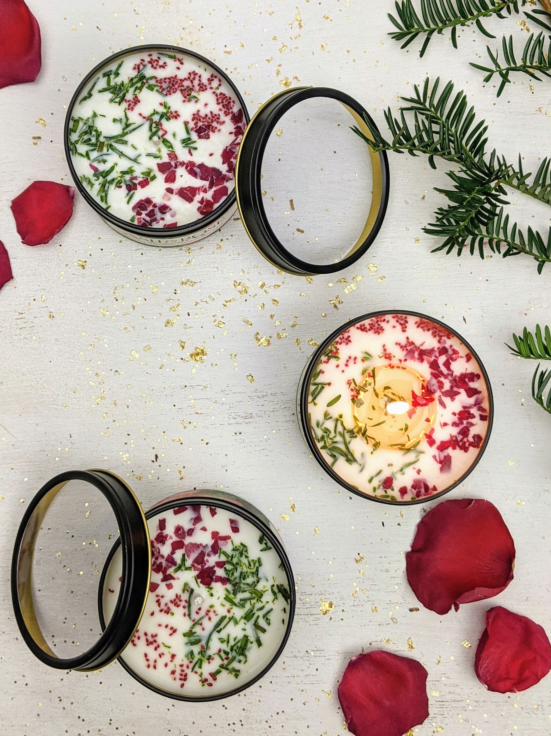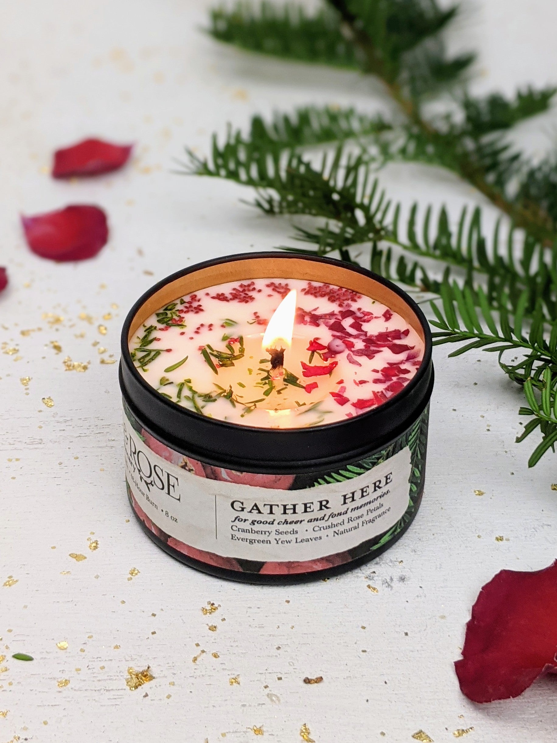 This handmade soy candle is packed with festive color and aroma. The beautiful matte black tin is lined in shiny gold, filled with USA made 100% soy wax, and topped with cranberry seeds, evergreen yew leaves, and crushed red rose petals.