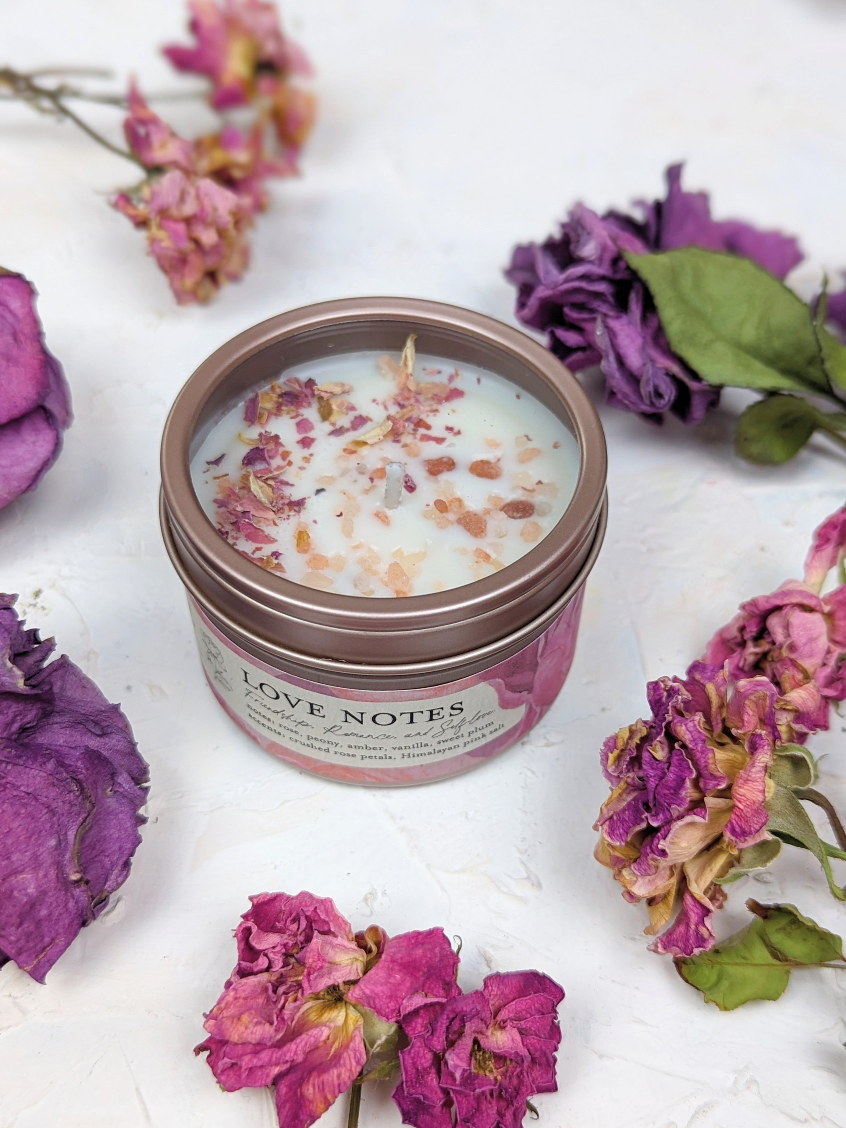 Our "Love Notes" fragrance blend is fresh and romantic, featuring hints of rose, peony, vanilla, amber, and sweet plum.