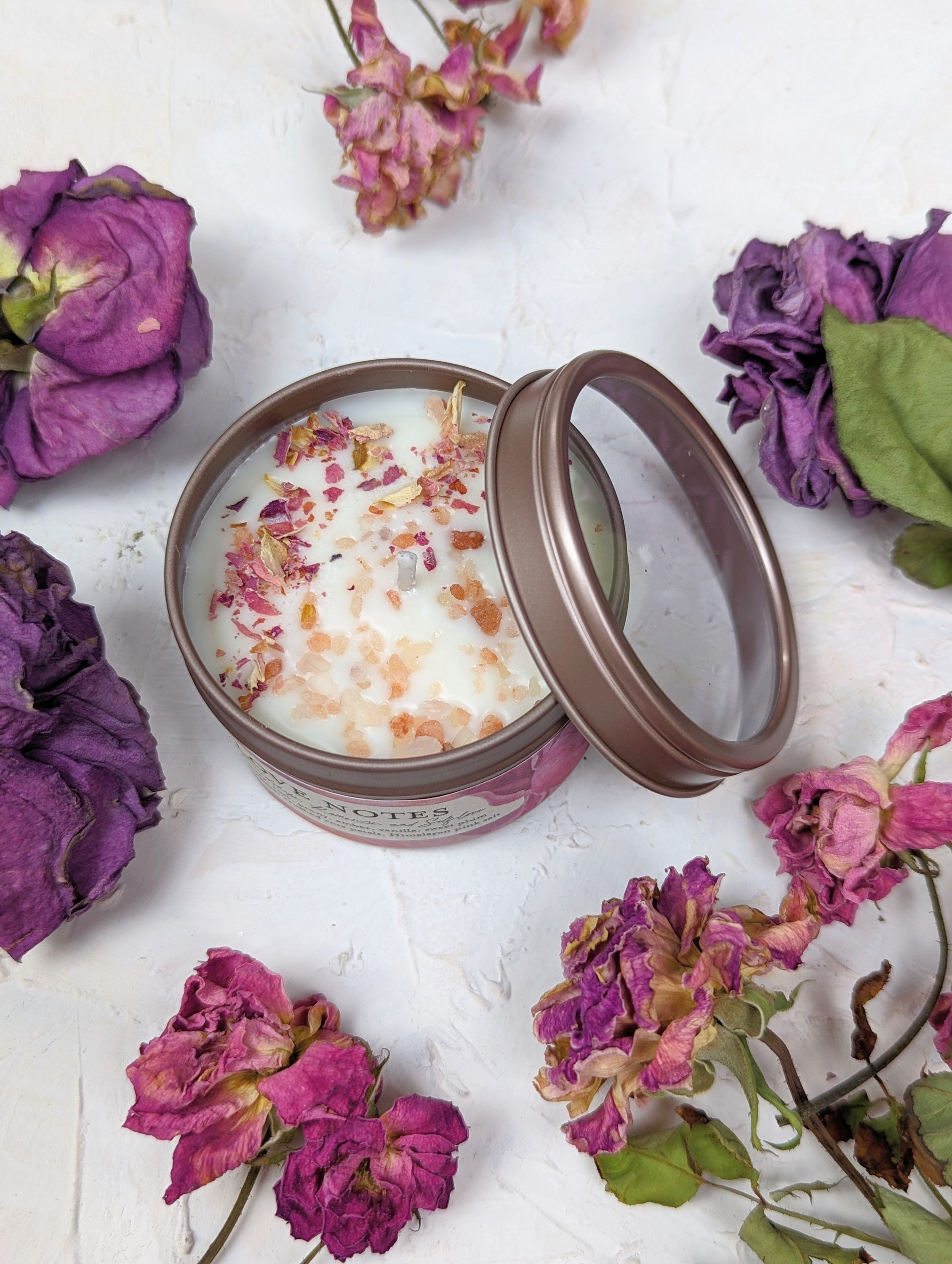 Pure soy wax candle, handmade in the USA with natural fragrance oils, Himalayan pink salt, and rose petals from our own gardens. Packaged in a rose gold can with lid for easy storage and travel.