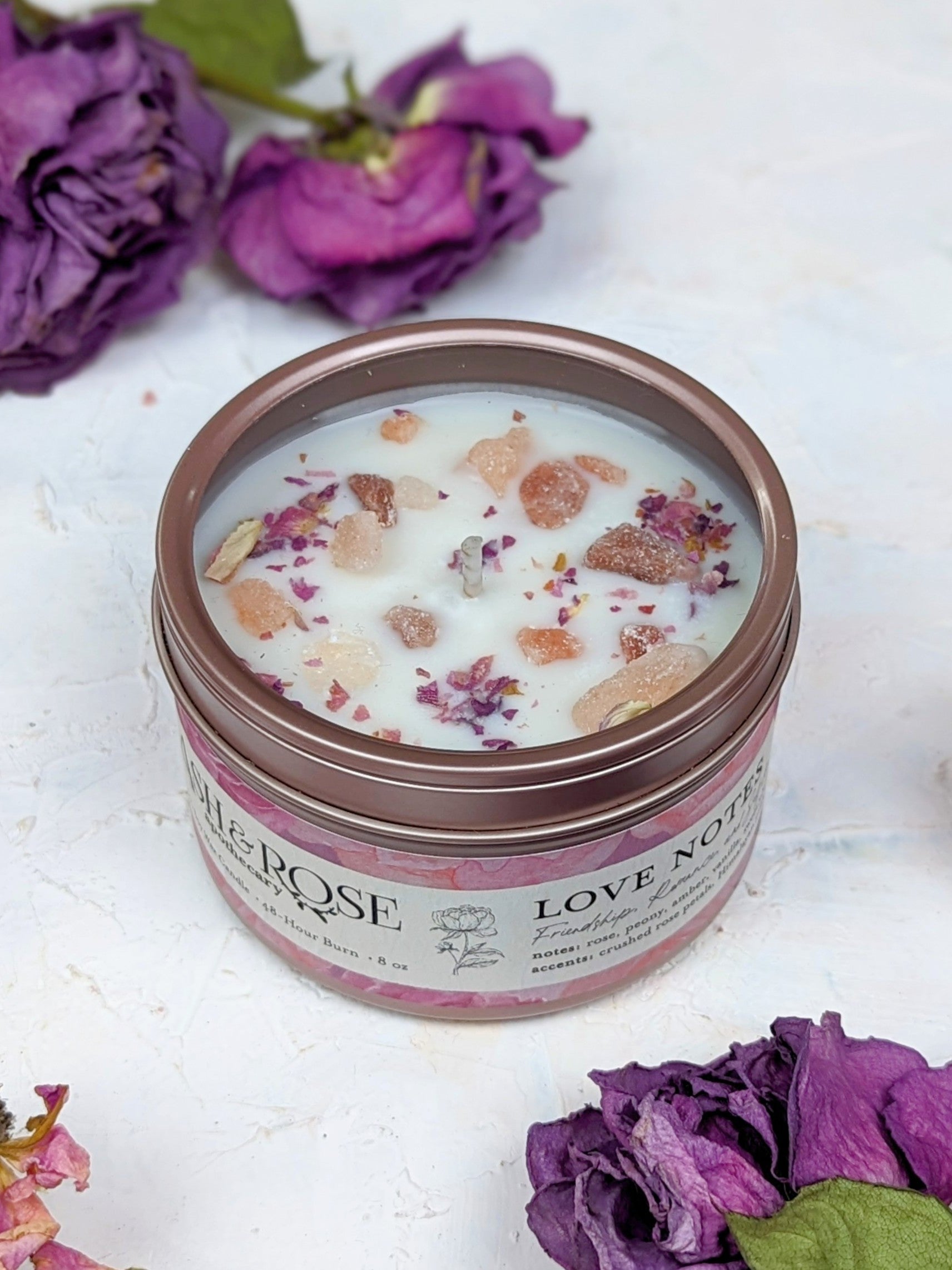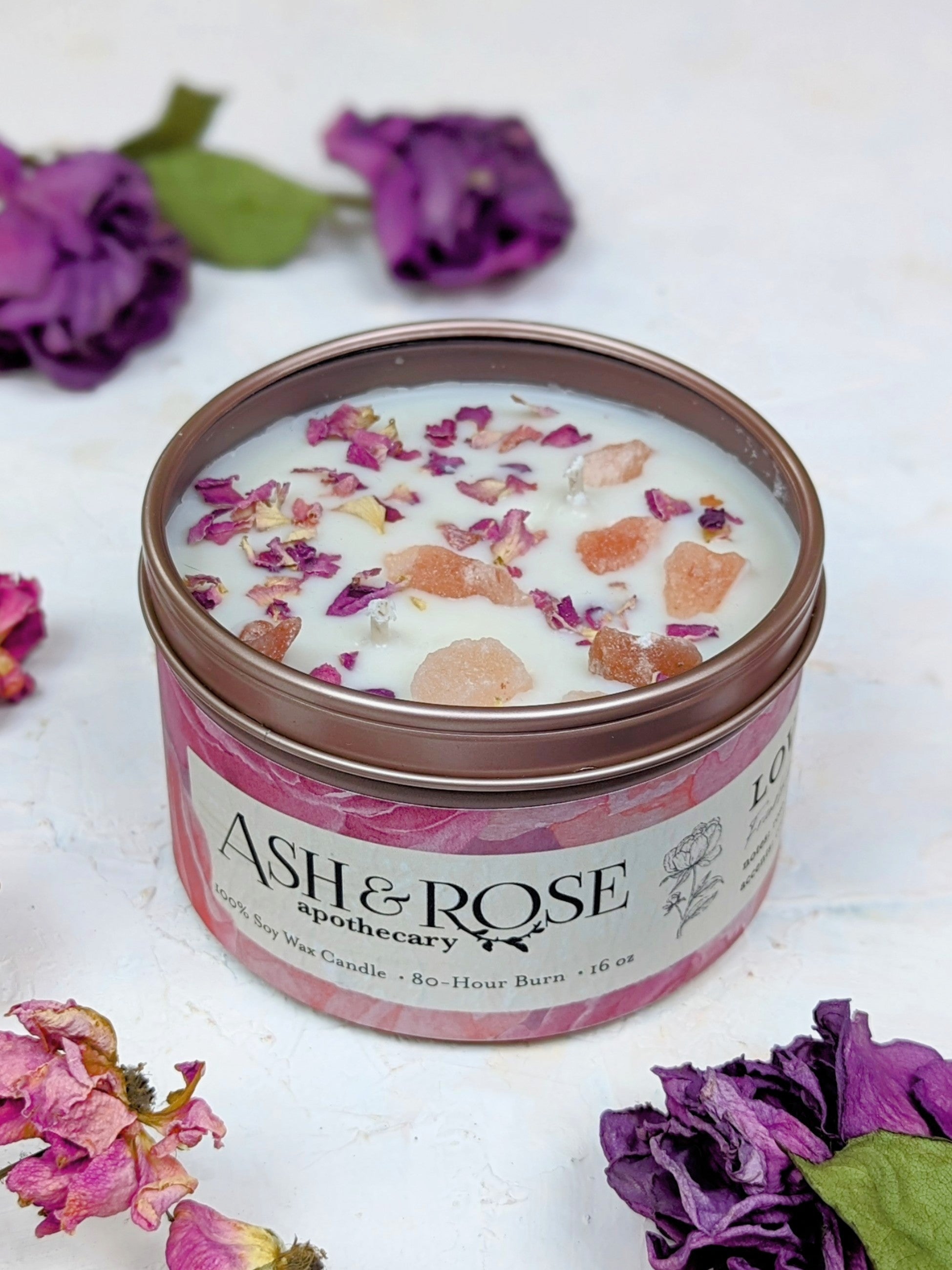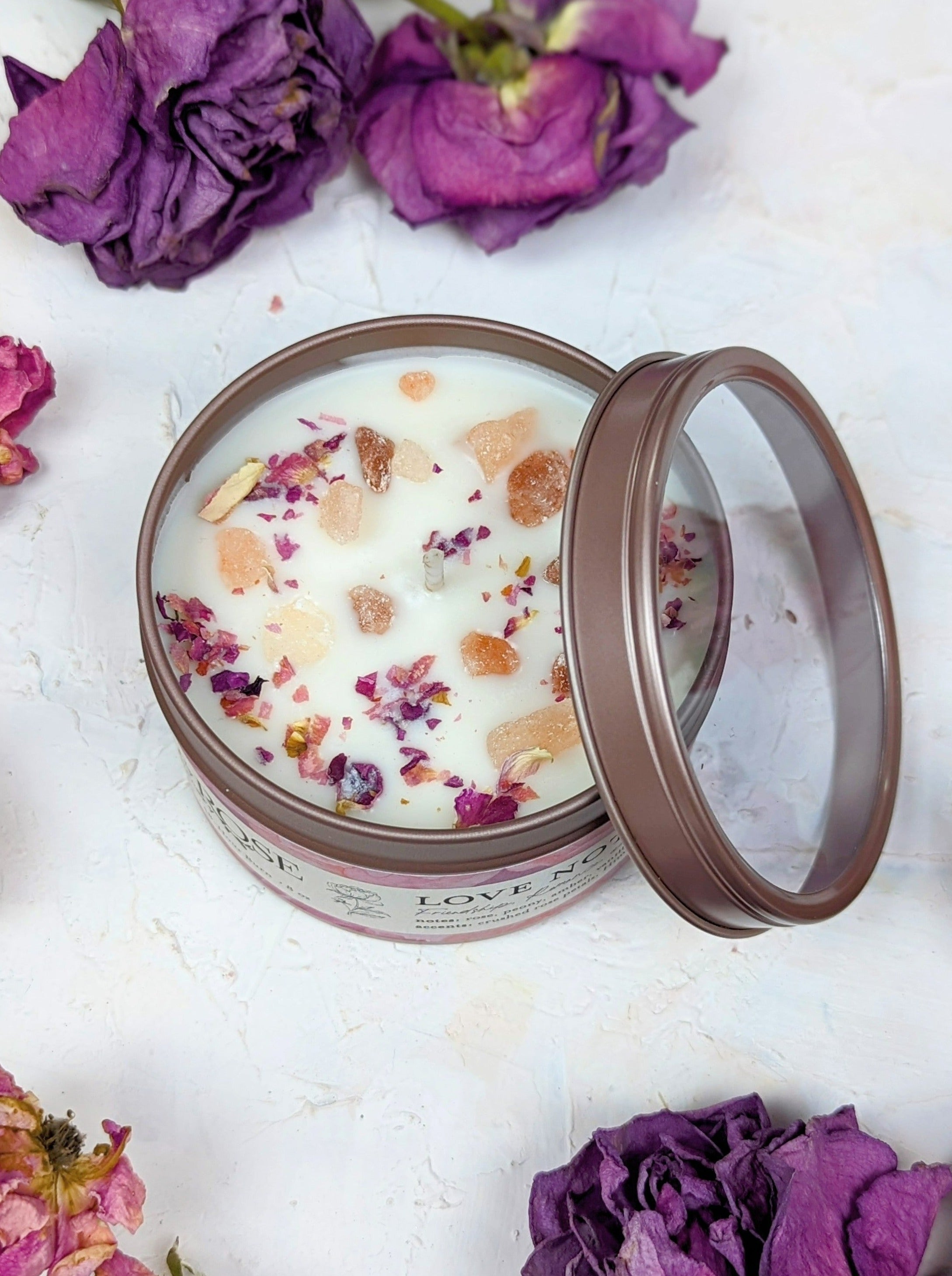 Designed to enhance all forms of love, including friendship, romance, and most of all self-love. These candles are made with love using flower petals from our own gardens!