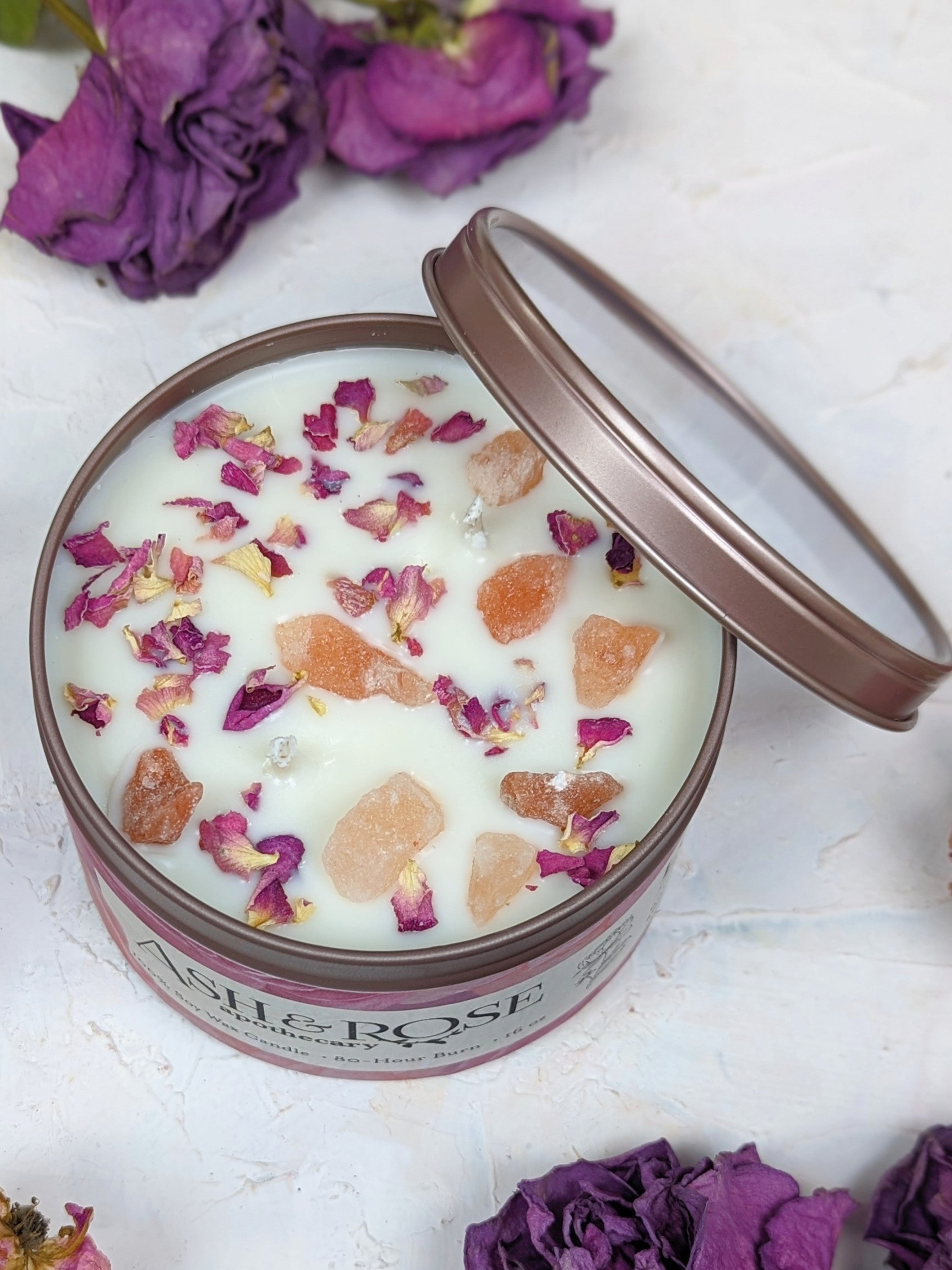 This dreamy soy candle is is packed with beautiful crushed rose petals and Himalayan pink salt crystals that sparkle and swim in the warm, lightly scented wax.