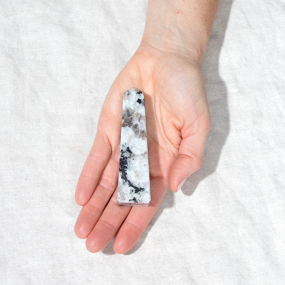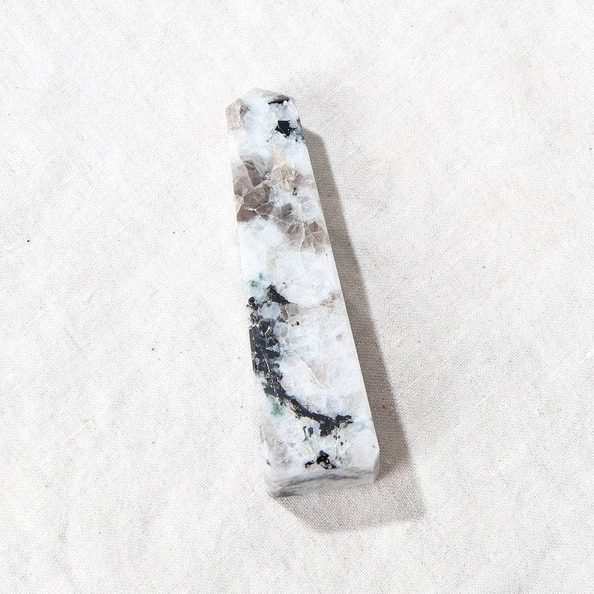 A crystal of inward vision, the Rainbow Moonstone takes its sparkle from the stars, its lessons from the natural hands of time, and its color of pearly white light to bring peace, harmony, and a sense of higher emotional healing into our hearts. In its tantalizing tower shape, the Moonstone becomes a torch to which we can turn when life’s shadows fall long and dark. This tower can lead you out of lost corners and into the glimmer of comforting moonlight as it reminds us to balance, change, and the turning of the page are all part of the tapestry of life.