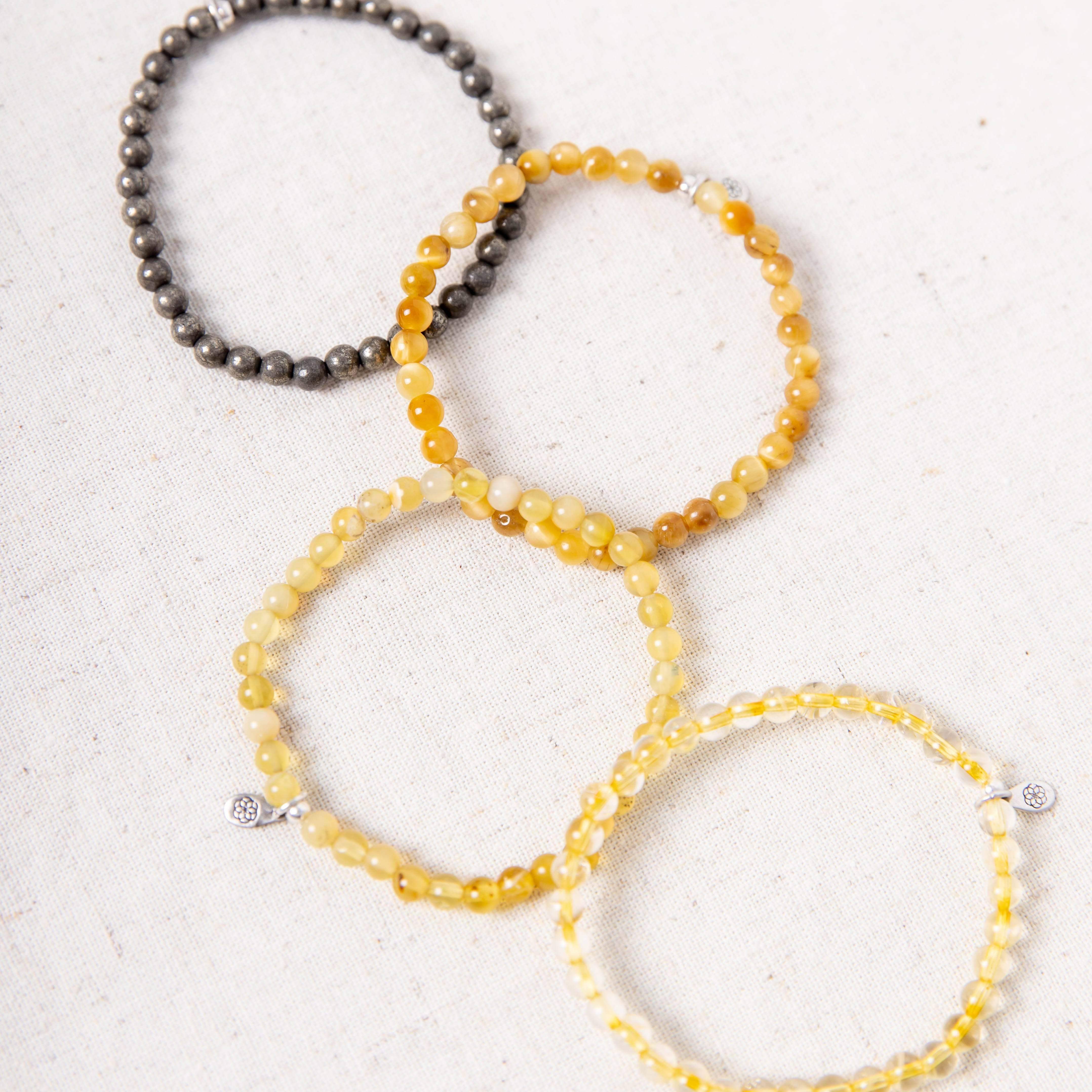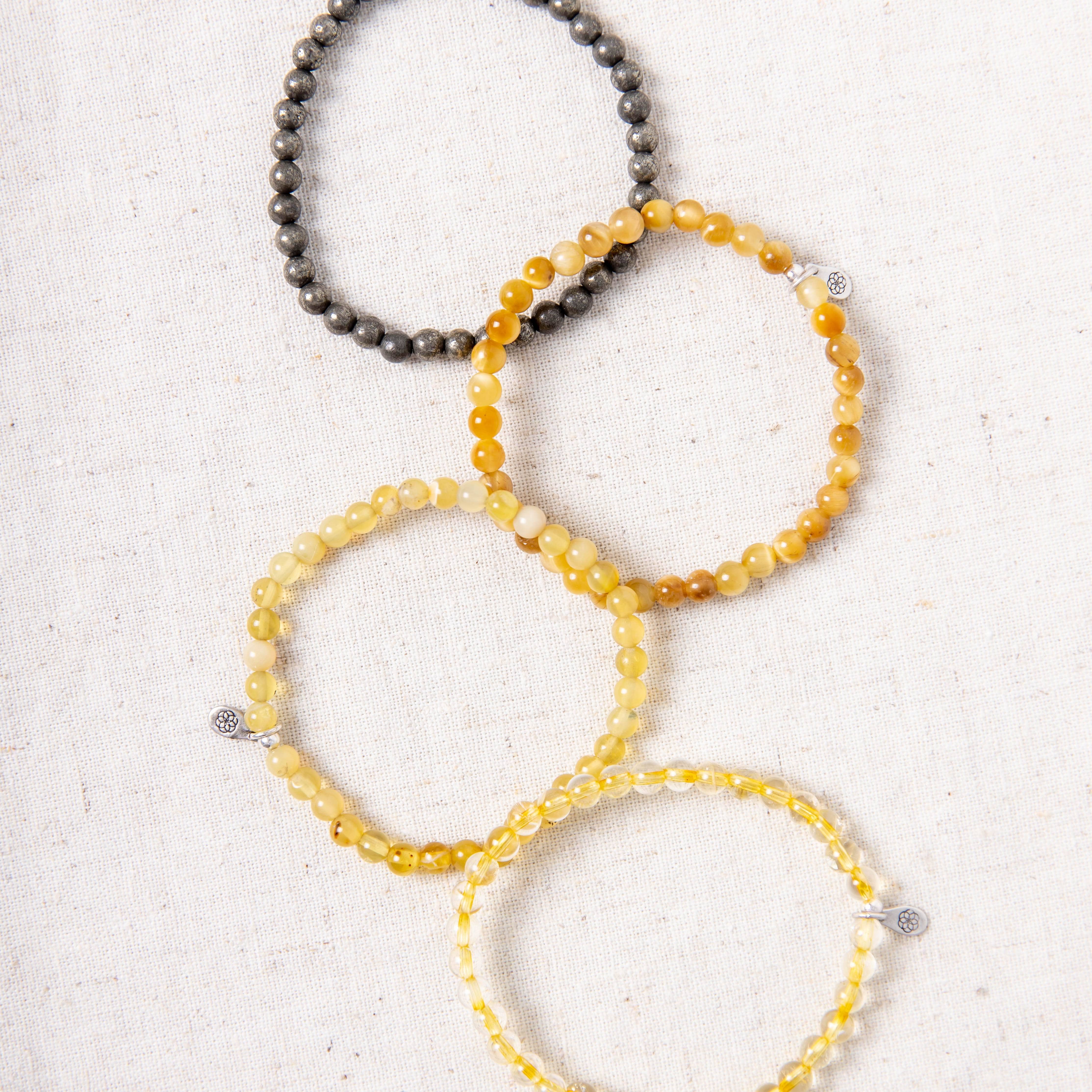 Shimmer your way to self-esteem with the bright and beautiful Solar Plexus Bracelet Set. Ramp up your personal power with the sunny delight of Citrine, the Kundalini rousing gleam of the Golden Tiger Eye, the homely warmth of Yellow Topaz, and the fire of Pyrite.