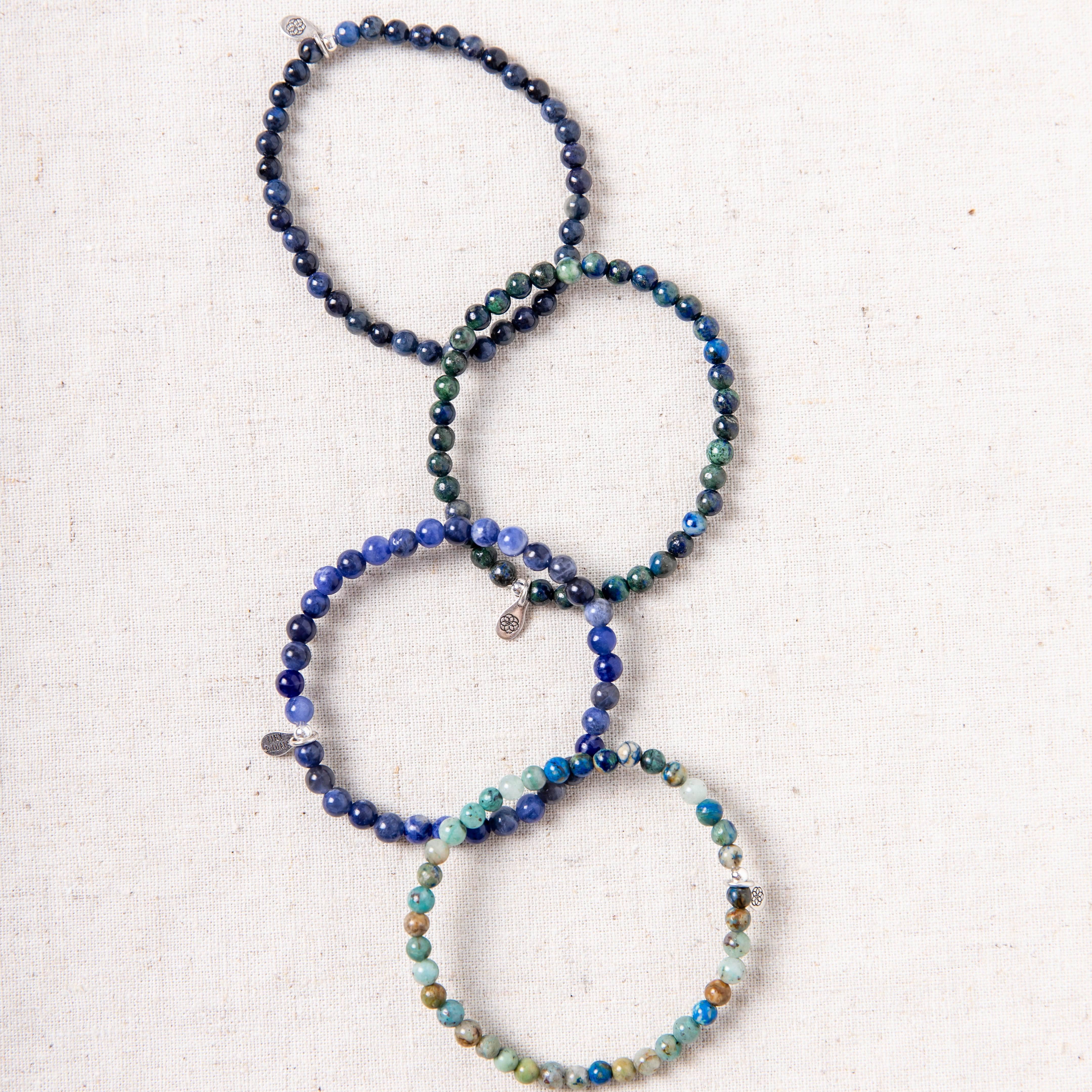The indigo wash sitting in the center of your brow, the third eye chakra is where we start to enter our own universe of intuition and understanding. For those who feel like they need a little help understanding their purpose, either in a higher sense or with both feet firmly on the floor, the big picture stones of Sodalite, Azurite, Chrysocolla, and Dumortierite come together to open the vault.