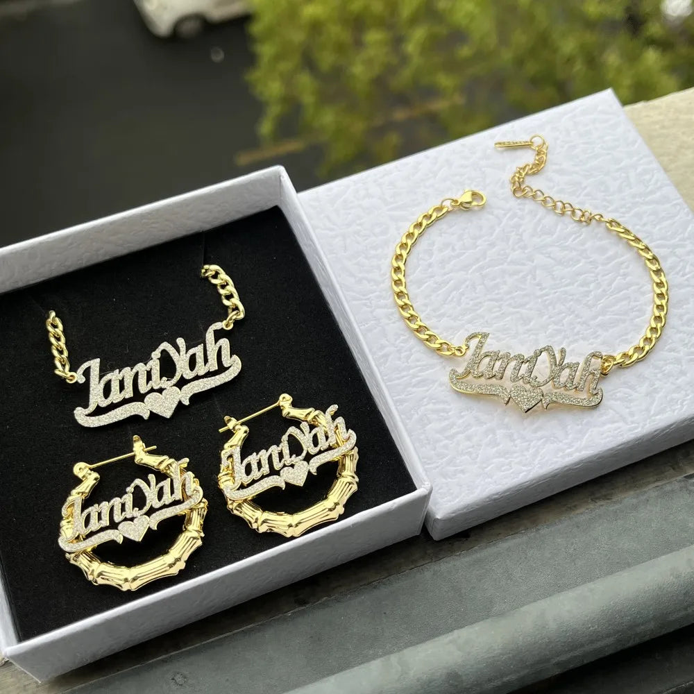 DUOYING Custom Bamboo Set Personalized Cuban Chain Namaplate Necklace Bling Thicker Letter Bracelet 30mm Bamboo Hoops Jewelry