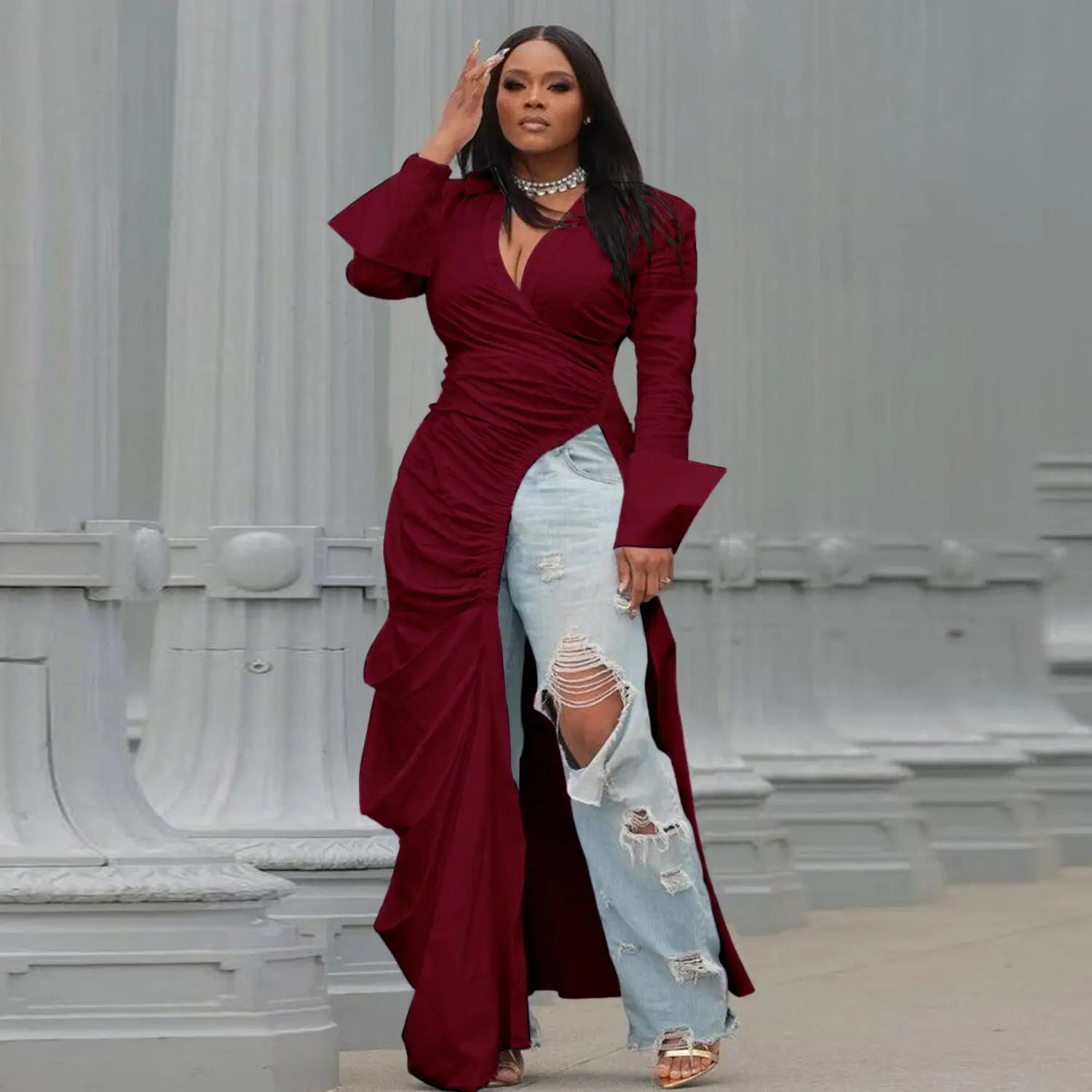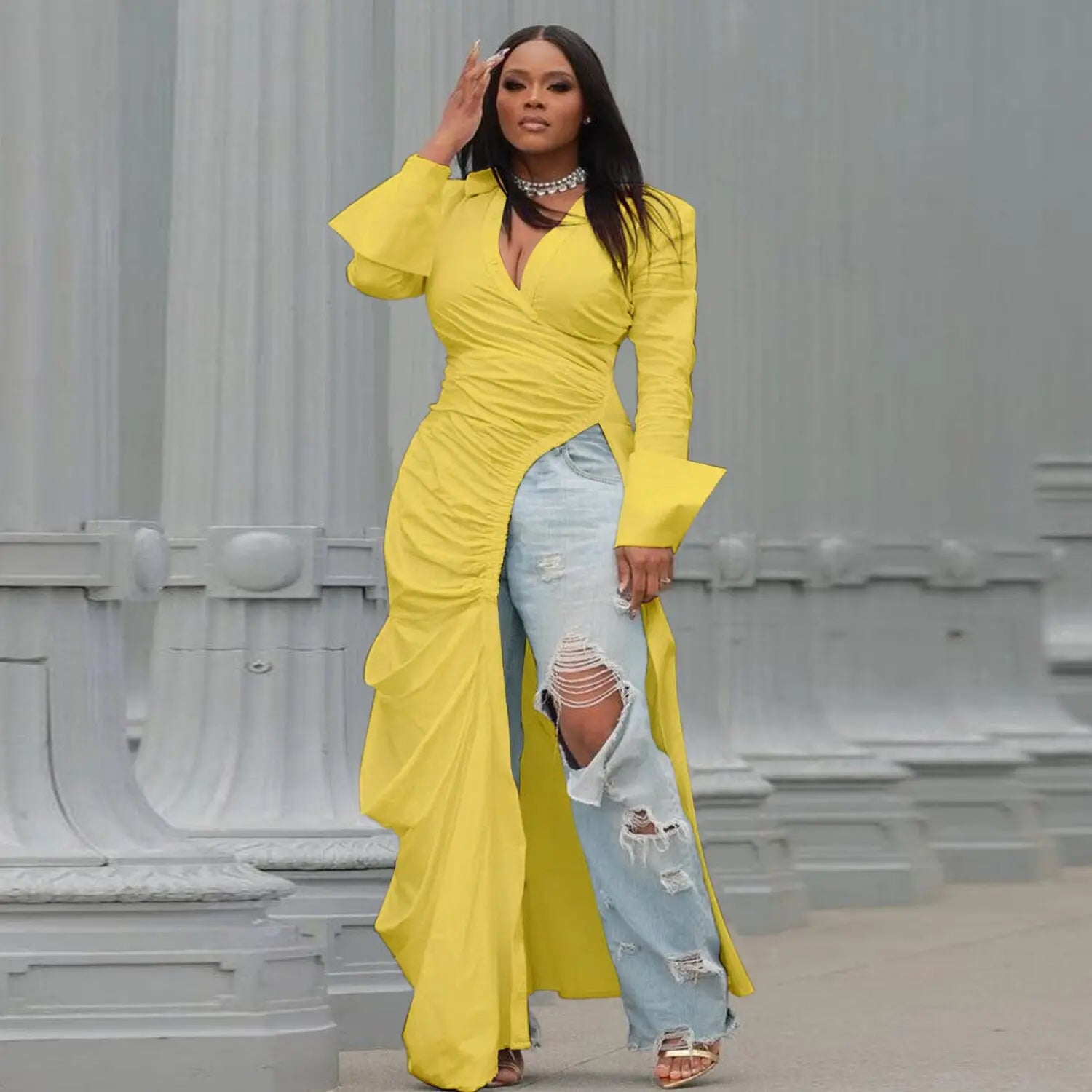 Vintage Women Long Sleeve High Side Split Ruched Up Wrap Lapel Collar White Maxi Long Dress Shirt