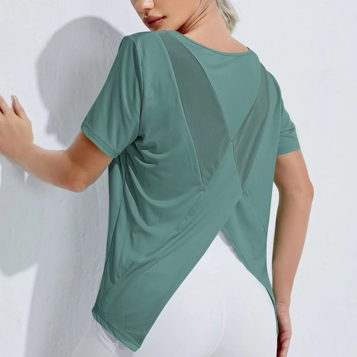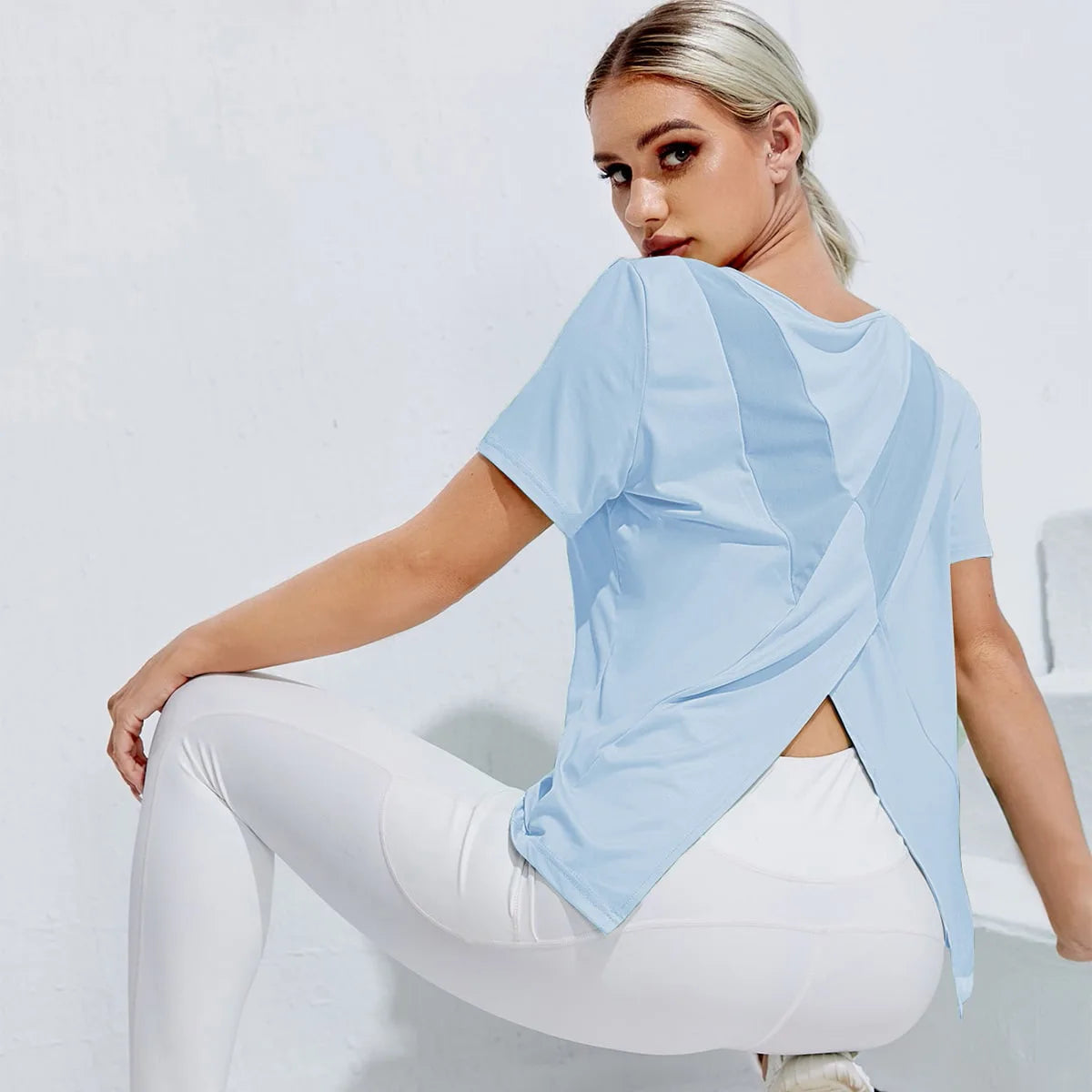 Women's Yoga Shirt Backless Short Sleeve Gym Fitness Sportswear Sexy Beauty Back Tops Breathable Loose Running Workout T-shirt