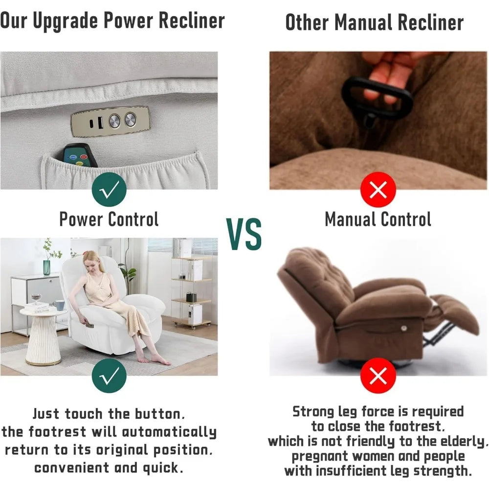 • Electric Adjustable Recliner: Are you still worried about the difficult to close recliner? overstuffed electric recliner can be opened or closed through the button, and you can adjust the position of the backrest and footrest with any control, which is a perfect solution to the problem of small leg strength that makes it difficult to close the traditional recliners, and makes your leisure time more enjoyable. Ideal for the elderly, leg injuries, and pregnant women.