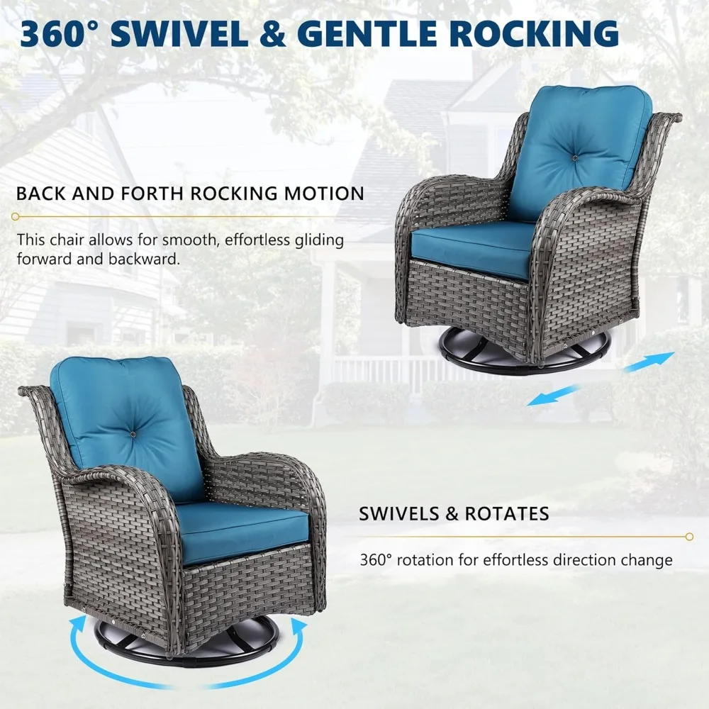 Rotating Rocker 3-Piece Patio Set: Includes 2 swivel and gliding patio chairs and 1 tempered glass-topped side table. Designed specifically for patios, front porches, balconies, and sunrooms, this modern coastal-style outdoor furniture set combines natural wicker with vibrant royal blue waterproof cushions to brighten your outdoor space.