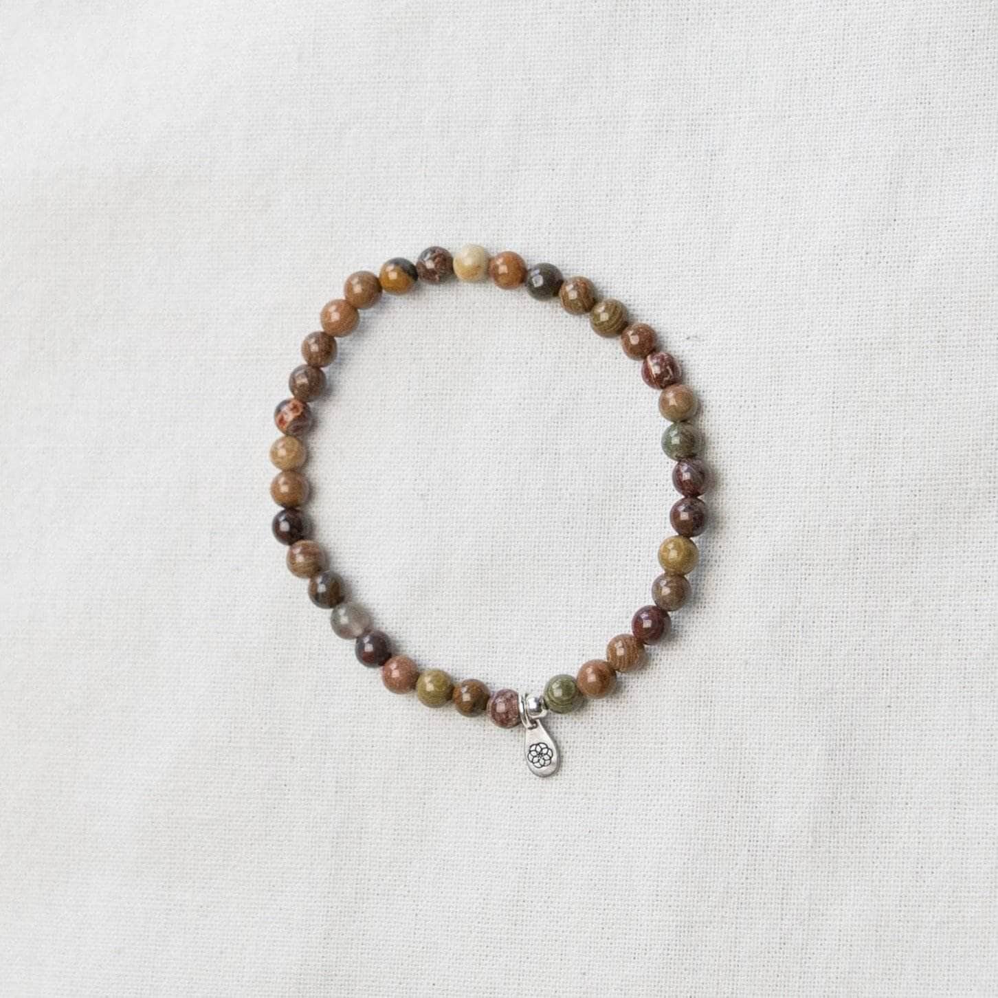 With deep earthy shades of swirling color, the Rainbow Jasper Energy Bracelet is a stone with high grounding energy. Rainbow Jasper is where you turn when seeking stress relief and to tap into the good fortune of the universe.