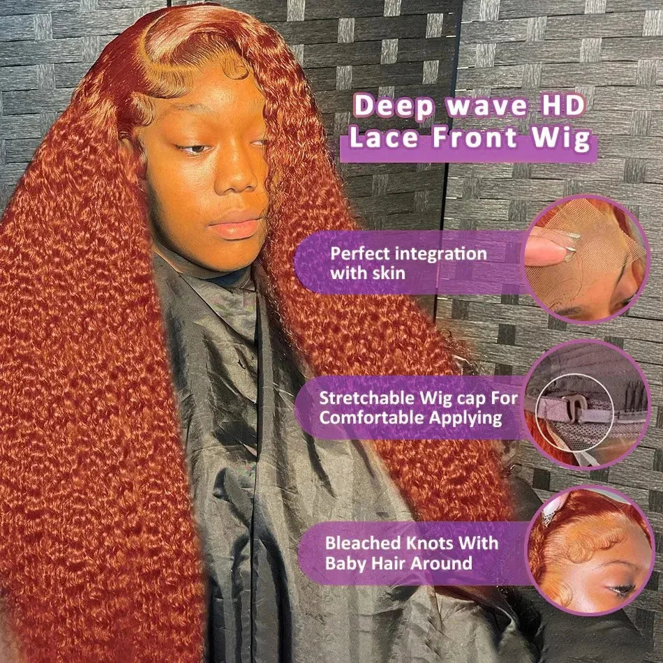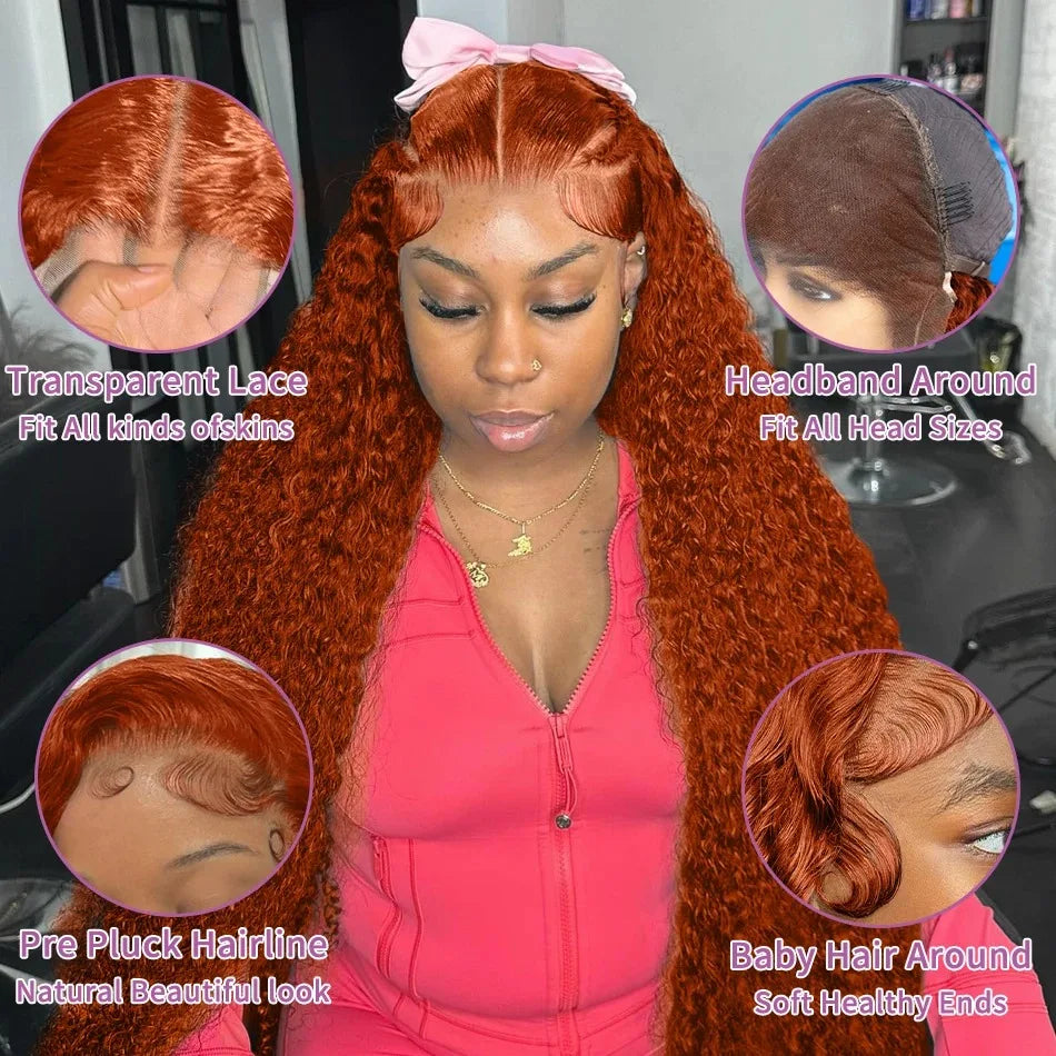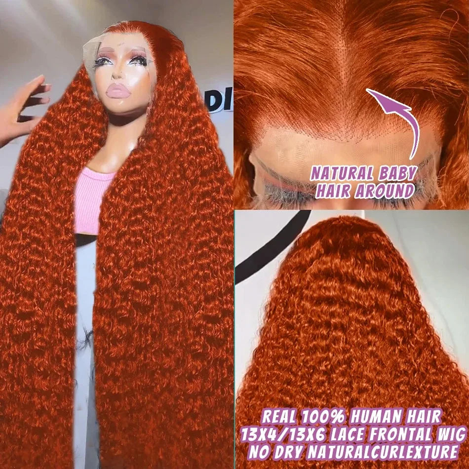 YKB 30 40 Inch 350 Ginger Kinky Curly 13x6 HD Lace Front Human Hair Wigs Orange Colored Deep Wave 13x4 Frontal Wig For Women